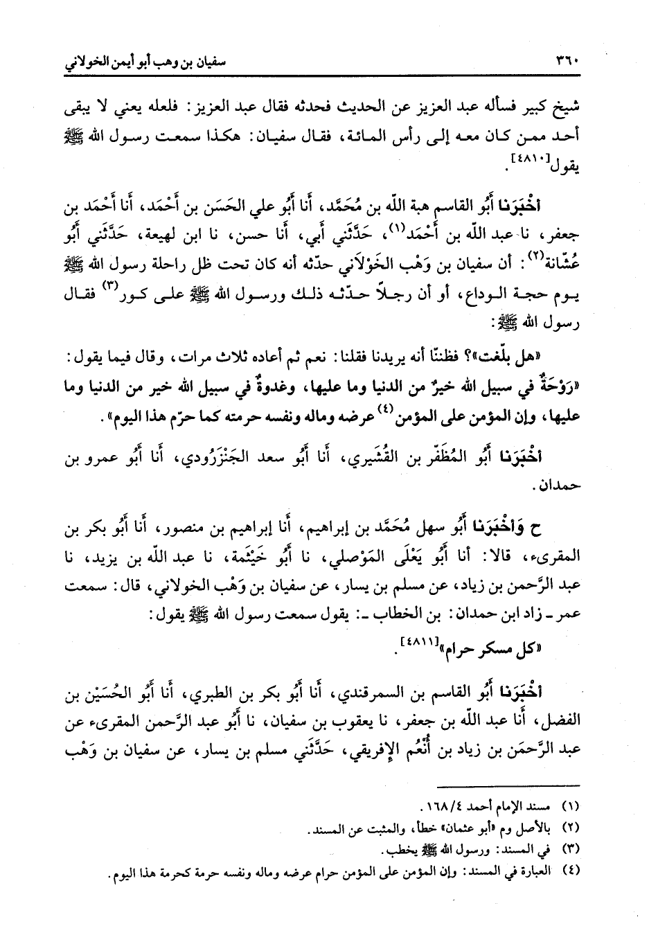 شيخ كبير فسأله عبد العزيز عن الحديث فحدثه فقال عبد العزيز فلعله يعني لا يبقى أحد ممن كان معه إلى رأس المائة فقال سفيان هكذا سمعت رسول الله (صلى الله عليه وسلم) يقول أخبرنا أبو القاسم هبة الله بن محمد أنا أبو علي الحسن بن أحمد أنا أحمد بن جعفر نا عبد الله بن أحمد (1) حدثني أبي أنا حسن نا ابن لهيعة حدثني أبو عشانة (2) أن سفيان بن وهب الخولاني حدثه أنه كان تحت ظل راحلة رسول اله (صلى الله عليه وسلم) يوم حجة الوداع أو أن رجلا حدثه ذلك ورسول الله (صلى الله عليه وسلم) على كور (3) فقال رسول الله (صلى الله عليه وسلم) هل بلغت فظننا أنه يريدنا فقلنا نعم ثم أعاده ثلاث مرات وقال فيما يقول روحة في سبيل الله خير من الدنيا وما عليها وغدوة في سبيل الله خير من الدنيا وما عليها وإن المؤمن على المؤمن (4) عرضه وماله ونفسه حرمته كما حرم هذا اليوم أخبرنا أبو المظفر بن القشيري أنا أبو سعد الجنزرودي أنا أبو عمرو بن حمدان ح وأخبرنا أبو سهل محمد بن إبراهيم أنا إبراهيم بن منصور أنا أبو بكر بن المقرئ قالا أنا أبو يعلى الموصلي نا أبو خيثمة نا عبد الله بن يزيد نا عبد الرحمن بن زياد عن مسلم بن يسار عن سفيان بن وهب الخولاني قال سمعت عمر زاد ابن حمدان بن الخطاب يقول سمعت رسول الله (صلى الله عليه وسلم) يقول كل مسكر حرام أخبرنا أبو القاسم بن السمرقندي أنا أبو بكر بن الطبري أنا أبو الحسين بن الفضل أنا عبد الله بن جعفر نا يعقوب بن سفيان نا أبو عبد الرحمن المقرئ عن عبد الرحمن بن زياد بن أنعم الإفريقي حدثني مسلم بن يسار عن سفيان بن وهب