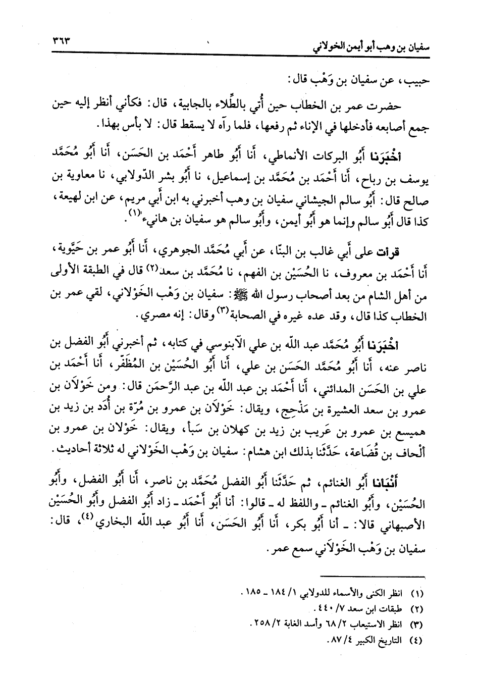 حبيب عن سفيان بن وهب قال حضرت عمر بن الخطاب حين أتي بالطلاء بالجابية قال فكأني أنظر إليه حين جمع أصابعه فأدخلها في الإناء ثم رفعها فلما رآه لا يسقط قال لا بأس بهذا أخبرنا أبو البركات الأنماطي أنا أبو طاهر أحمد بن الحسن أنا أبو محمد يوسف بن رباح أنا أحمد بن محمد بن إسماعيل نا أبو بشر الدولابي نا معاوية بن صالح قال أبو سالم الجيشاني سفيان بن وهب أخبرني به ابن أبي مريم عن ابن لهيعة كذا قال أبو سالم وإنما هو أبو أيمن وأبو سالم هو سفيان بن هانئ (1) قرأت على أبي غالب بن البنا عن أبي محمد الجوهري أنا أبو عمر بن حيوية أنا أحمد بن معروف نا الحسين بن الفهم نا محمد بن سعد (2) قال في الطبقة الأولى من أهل الشام من بعد أصحاب رسول الله (صلى الله عليه وسلم) سفيان بن وهب الخولاني لقي عمر بن الخطاب كذا قال وقد عده غيره في الصحابة (3) وقال إنه مصري أخبرنا أبو محمد عبد الله بن علي الآبنوسي في كتابه ثم أخبرني أبو الفضل بن ناصر عنه أنا أبو محمد الحسن بن علي أنا أبو الحسين بن المظفر أنا أحمد بن علي بن الحسن المدائني أنا أحمد بن عبد الله بن عبد الرحمن قال ومن خولان بن عمرو بن سعد العشيرة بن مذحج ويقال خولان بن عمرو بن مرة بن أدد بن زيد بن هميسع بن عمرو بن عريب بن زيد بن كهلان بن سبأ ويقال خولان بن عمرو بن ألحاف بن قضاعة حدثنا بذلك ابن هشام سفيان بن وهب الخولاني له ثلاثة أحاديث أنبأنا أبو الغنائم ثم حدثنا أبو الفضل محمد بن ناصر أنا أبو الفضل وأبو الحسين وأبو الغنائم واللفظ له قالوا أنا أبو أحمد زاد أبو الفضل وأبو الحسين الأصبهاني قالا أنا أبو بكر أنا أبو الحسن أنا أبو عبد الله البخاري (4) قال سفيان بن وهب الخولاني سمع عمر