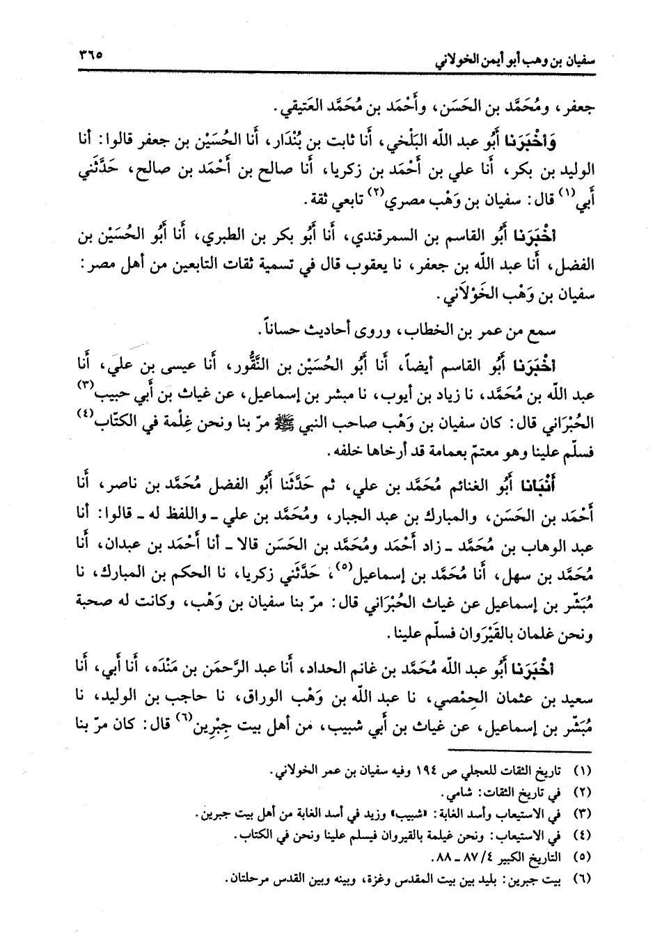 جعفر ومحمد بن الحسن وأحمد بن محمد العتيقي وأخبرنا أبو عبد الله البلخي أنا ثابت بن بندار أنا الحسين بن جعفر قالوا أنا الوليد بن بكر أنا علي بن أحمد بن زكريا أنا صالح بن أحمد بن صالح حدثني أبي (1) قال سفيان بن وهب مصري (2) تابعي ثقة أخبرنا أبو القاسم بن السمرقندي أنا أبو بكر بن الطبري أنا أبو الحسين بن الفضل أنا عبد الله بن جعفر نا يعقوب قال في تسمية ثقات التابعين من أهل مصر سفيان بن وهب الخولاني سمع عمر بن الخطاب وروى أحاديث حسانا أخبرنا أبو القاسم أيضا أنا أبو الحسين بن النقور أنا عيسى بن علي أنا عبد الله بن محمد نا زياد بن أيوب نا مبشر بن إسماعيل عن غياث بن أبي حبيب (3) الحبراني قال كان سفيان بن وهب صاحب النبي (صلى الله عليه وسلم) مر بنا ونحن غلمة في الكتاب (4) فسلم علينا وهو معتم بعمامة قد أرخاها خلفه أنبأنا أبو الغنائم محمد بن علي ثم حدثنا أبو الفضل محمد بن ناصر أنا أحمد بن الحسن والمبارك بن عبد الجبار ومحمد بن علي واللفظ له قالوا أنا عبد الوهاب بن محمد زاد أحمد ومحمد بن الحسن قالا أنا أحمد بن عبدان أنا محمد بن سهل أنا محمد بن إسماعيل (5) حدثني زكريا نا الحكم بن المبارك نا مبشر بن إسماعيل عن غياث الحبراني قال مر بنا سفيان بن وهب وكانت له صحبة ونحن غلمان بالقيروان فسلم علينا أخبرنا أبو عبد الله محمد بن غانم الحداد أنا عبد الرحمن بن منده أنا أبي أنا سعيد بن عثمان الحمصي نا عبد الله بن وهب الوراق نا حاجب بن الوليد نا مبشر بن إسماعيل عن غياث بن أبي شبيب من أهل بيت جبرين (6) قال كان مر بنا