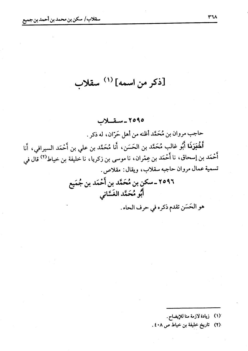 / ذكر من اسمه (1) سقلاب / 2595 سقلاب حاجب مروان بن محمد أظنه من أهل حران له ذكر أخبرنا أبو غالب محمد بن الحسن أنا محمد بن علي بن أحمد السيرافي أنا أحمد بن إسحاق نا أحمد بن عمران نا موسى بن زكريا نا خليفة بن خياط (2) قال في تسمية عمال مروان حاجبه سقلاب ويقال مقلاص