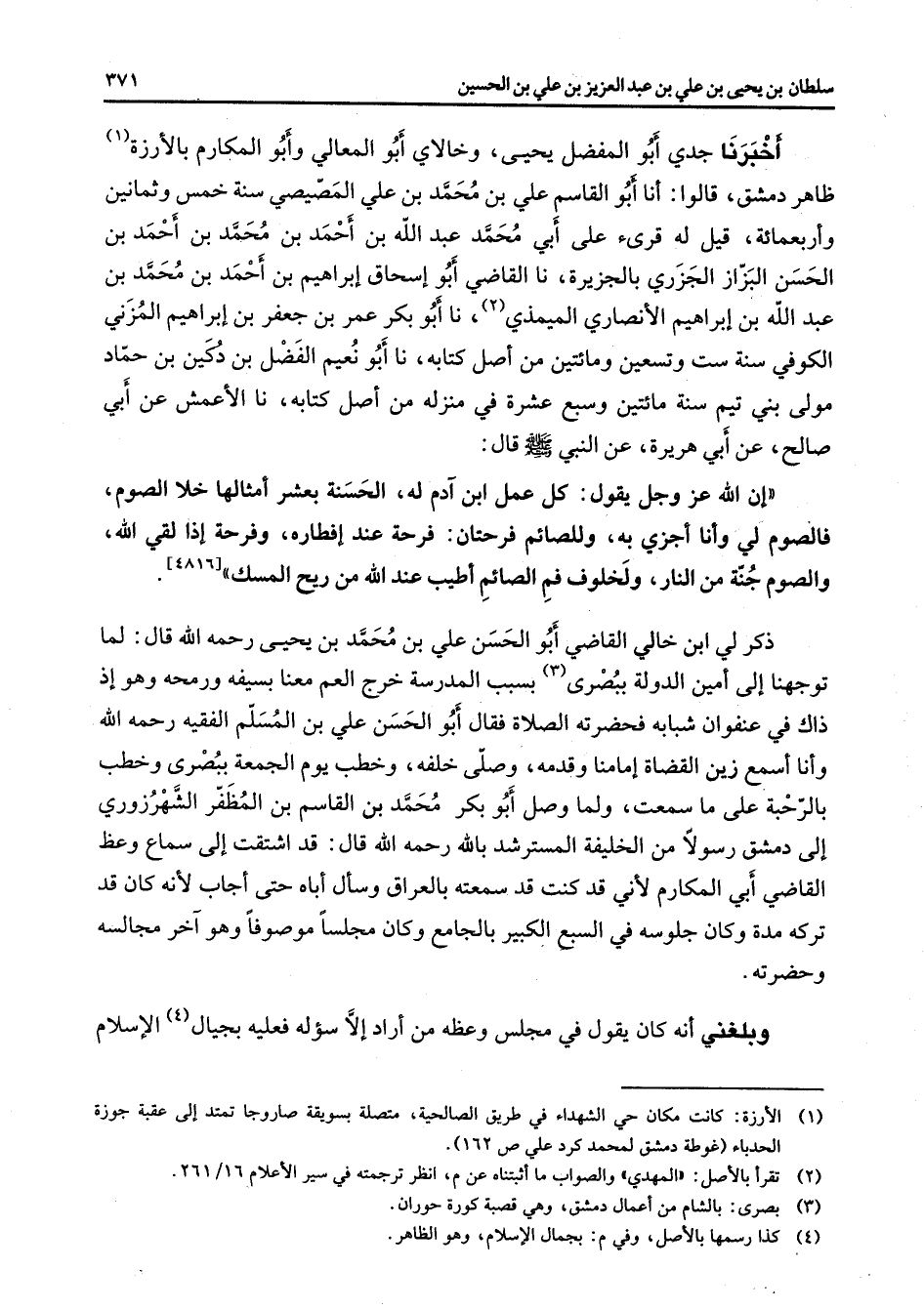 أخبرنا جدي أبو المفضل يحيى وخالاي أبو المعالي وأبو المكارم بالأرزة (1) ظاهر دمشق قالوا أنا أبو القاسم علي بن محمد بن علي المصيصي سنة خمس وثمانين وأربعمائة قيل له قرئ على أبي محمد عبد الله بن أحمد بن محمد بن أحمد بن الحسن البزاز الجزري بالجزيرة نا القاضي أبو إسحاق إبراهيم بن أحمد بن محمد بن عبد الله بن إبراهيم الأنصاري الميمذي (2) نا أبو بكر عمر بن جعفر بن إبراهيم المزني الكوفي سنة ست مائتين وسبع عشرة في منزله من أصل كتابه نا الأعمش عن أبي صالح عن أبي هريرة عن النبي (صلى الله عليه وسلم) قال إن الله عز وجل يقول كل عمل ابن آدم له الحسنة بعشر أمثالها خلا الصوم فالصوم لي وأنا أجزي به وللصائم فرحتان فرحة عند إفطاره وفرحة إذا لقي الله والصوم جنة من النار ولخلوف فم الصائب أطيب عند الله من ريح المسك ذكر لي ابن خالي القاضي أبو الحسن علي بن محمد بن يحيى رحمه الله قال لما توجهنا إلى أمين الدولة ببصرى (3) بسبب المدرسة خرج العم معنا بسيفه ورمحه وهو إذا ذاك في عنفوان شبابه فحضرته الصلاة فقال أبو الحسن علي بن المسلم الفقيه رحمه الله وأنا أسمع زين القضاة إمامنا وقدمه وصلى خلفه وخطب يوم الجمعة ببصرى وخطب بالرحبة على ما سمعت ولما وصل أبو بكر محمد بن القاسم بن المظفر الشهرزوري إلى دمشق رسولا من الخليفة المسترشد بالله رحمه الله قال قد اشتقت إلى سماع وعظ القاضي أبي المكارم لأني قد كنت قد سمعته بالعراق وسأل أباه حتى أجاب لأنه كان قد تركه مدة وكان جلوسا في السبع الكبير بالجامع وكان مجلسا موصوفا وهو آخر مجالسه وحضرته وبلغني أنه كان يقول في مجلس وعظه من أراد إلا سؤله فعليه بجيال (4) الإسلام