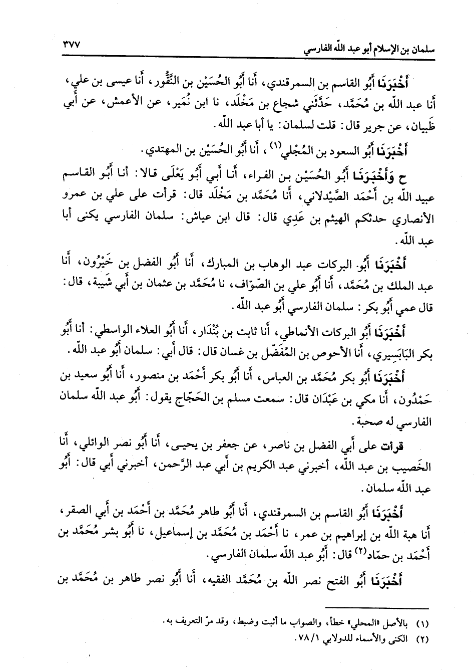 أخبرنا أبو القاسم بن السمرقندي أنا أبو الحسين بن النقور أنا عيسى بن علي أن عبد الله بن محمد حدثني شجاع بن مخلد نا ابن نمير عن الأعمش عن أبي ظبيان عن جرير قال قلت لسلمان يا أبا عبد الله أخبرنا أبو السعود بن المجلي (1) أنا أبو الحسين بن المهتدي ح وأخبرنا أبو الحسين بن الفراء أنا أبي أبو يعلى قالا أنا أبو القاسم عبيد الله بن أحمد الصيدلاني أنا محمد بن مخلد قال قرأت على علي بن عمرو الأنصاري حدثكم الهيثم بن عدي قال قال ابن عياش سلمان الفارسي يكنى أبا عبد الله أخبرنا أبو البركات عبد الوهاب بن المبارك أنا أبو الفضل بن خيرون أنا عبد الملك بن محمد أنا أبو علي بن الصواف نا محمد بن عثمان بن أبي شيبة قال قال عمر أبو بكر سلمان الفارسي أبو عبد الله أخبرنا أبو البركات الأنماطي أنا ثابت بن بندار أنا أبو العلاء الواسطي أنا أبو بكر البابسيري أنا الأحوص بن المفضل بن غسان قال قال أبي سلمان أبو عبد الله أخبرنا أبو بكر محمد بن العباس أنا أبو بكر أحمد بن منصور أنا أبو سعيد بن حمدون أنا مكي بن عبدان قال سمعت مسلم بن الحجاج يقول أبو عبد الله سلمان الفارسي له صحبة قرأت على أبي الفضل بن ناصر عن جعفر بن يحيى أنا أبو نصر الوائلي أنا الخصيب بن عبد الله أخبرني عبد الكريم بن أبي عبد الرحمن أخبرني أبي قال أبو عبد الله سلمان أخبرنا أبو القاسم بن السمرقندي أنا أبو طاهر محمد بن أحمد بن أبي الصقر أنا هبة الله بن إبراهيم بن عمر نا أحمد بن محمد بن إسماعيل نا أبو بشر محمد بن أحمد بن حماد قال أبو عبد الله سلمان الفارسي أخبرنا أبو الفتح نصر الله بن محمد الفقيه أنا أبو نصر طاهر بن محمد بن