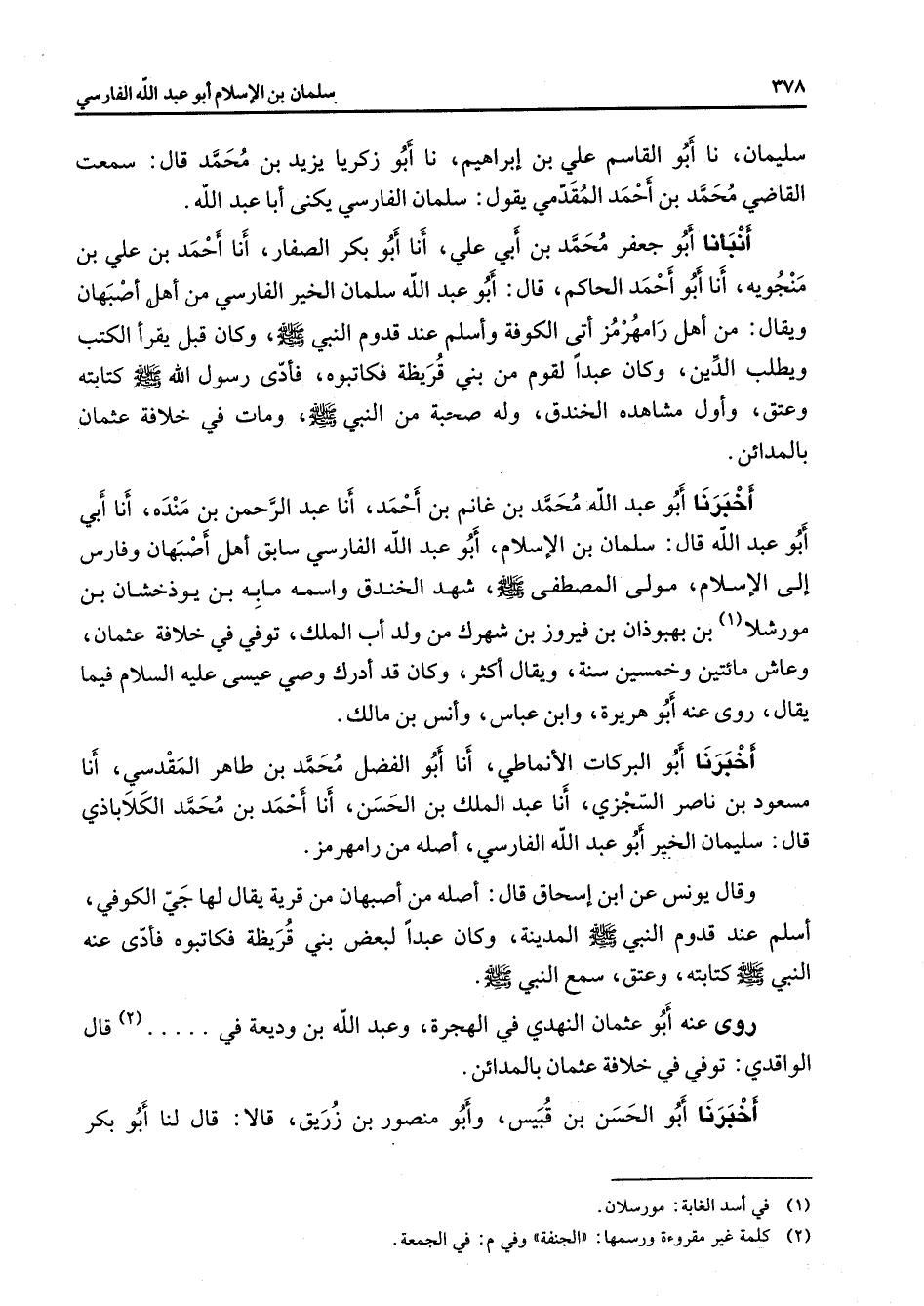 سليمان نا أبو القاسم علي بن إبراهيم نا أبو زكريا يزيد بن محمد قال سمعت القاضي محمد بن أحمد المقدمي يقول سلمان الفارسي يكنى أبا عبد الله أنبأنا أبو جعفر محمد بن أبي علي أنا أبو بكر الصفار أنا أحمد بن علي بن منجويه أنا أبو أحمد الحاكم قال أبو عبد الله سلمان الخير الفارسي من أهل أصبهان ويقال من أهل رامهرمز أتى الكوفة وأسلم عند قدوم النبي (صلى الله عليه وسلم) وكان قبل يقرأ الكتب ويطلب الدين وكان عبدا لقوم من بني قريظة فكاتبوه فأدى رسول الله (صلى الله عليه وسلم) كتابته وعتق وأول مشاهده الخندق وله صحبة من النبي (صلى الله عليه وسلم) ومات في خلافة عثمان بالمدائن أخبرنا أبو عبد الله محمد بن غانم بن أحمد أنا عبد الرحمن بن منده أنا أبي أبو عبد الله قال سلمان بن الإسلام أبو عبد الله الفارسي سابق أهل أصبهان وفارس إلى الإسلام مولى المصطفى (صلى الله عليه وسلم) شهد الخندق واسمه ما به بن يوذخشان بن مورشلا (1) بن بهبوذان بن فيروز بن شهرك من ولد أب الملك توفي في خلافة عثمان وعاش مائتين وخمسين سنة ويقال أكثر وكان قد أدرك وصي عيسى عليه السلام فيما يقال روى عنه أبو هريرة وابن عباس وأنس بن مالك أخبرنا أبو البركات الأنماطي أنا أبو الفضل محمد بن طاهر المقدسي أنا مسعود بن ناصر السجزي أنا عبد الملك بن الحسن أنا أحمد بن محمد الكلاباذي قال سليمان الخير أبو عبد الله الفارسي أصله من رامهرمز وقال يونس عن ابن إسحاق قال أصله من أصبهان من قرية يقال لها جي الكوفي أسلم عند قدوم النبي (صلى الله عليه وسلم) المدينة وكان عبدا لبعض بني قريظة فكاتبوه فأدى عنه النبي (صلى الله عليه وسلم) كتابته وعتق سمع النبي (صلى الله عليه وسلم) روى عنه أبو عثمان النهدي في الهجرة وعبد الله بن وديعة في (2) قال الواقدي توفي في خلافة عثمان بالمدائن أخبرنا أبو الحسن بن قبيس وأبو منصور بن زريق قالا قال لنا أبو بكر