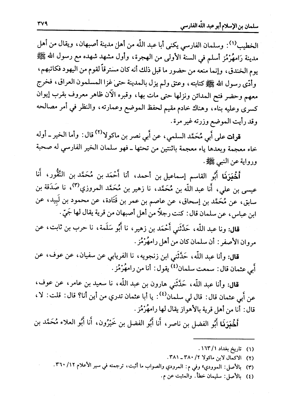 الخطيب (1) وسلمان الفارسي يكنى أبا عبد الله من أهل مدينة أصبهان ويقال من أهل مدينة رامهرمز أسلم في السنة الأولى من الهجرة وأول مشهد شهده مع رسول الله (صلى الله عليه وسلم) يوم الخندق وإنما منعه من حضور ما قبل ذلك أنه كان مسترقا لقوم من اليهود فكاتبهم وأدى رسول الله (صلى الله عليه وسلم) كتابته وعتق ولم يزل بالمدينة حتى غزا المسلمون العراق فخرج معهم وحضر فتح المدائن ونزلها حتى مات بها وقبره الآن ظاهر معروف بقرب إيوان كسرى وعليه بناء وهناك خادم مقيم لحفظ الموضع وعمارته والنظر في أمر مصالحه وقد رأيت الموضع وزرته غير مرة قرأت على أبي محمد السلمي عن أبي نصر بن ماكولا (2) قال وأما الخير أوله خاء معجمة وبعدها ياء معجمة باثنتين من تحتها فهو سلمان الخير الفارسي له صحبة ورواية عن النبي (صلى الله عليه وسلم) أخبرنا أبو القاسم إسماعيل بن أحمد أنا أحمد بن محمد بن النقور أنا عيسى بن علي أنا عبد الله بن محمد نا زهير بن محمد المروزي (3) نا صدقة بن سابق عن محمد بن إسحاق عن عاصم بن عمر بن قتادة عن محمود بن لبيد عن ابن عباس عن سلمان قال كنت رجلا من أهل أصبهان من قرية يقال لها جي قال ونا عبد الله حدثني أحمد بن زهير نا أبو سلمة نا حرب بن ثابت عن مروان الأصفر أن سلمان كان من أهل رامهرمز قال وأنا عبد الله حدثني ابن زنجويه نا الفريابي عن سفيان عن عوف عن أبي عثمان قال سمعت سلمان (4) يقول أنا من رامهرمز قال وأنا عبد الله حدثني هارون بن عبد الله نا سعيد بن عامر عن عوف عن أبي عثمان قال قال لي سلمان (4) يا أبا عثمان تدري من أين أنا قال قلت لا قال أنا من أهل قرية بالأهواز يقال لها رامهرمز أخبرنا أبو الفضل بن ناصر أنا أبو الفضل بن خيرون أن أبو العلاء محمد بن