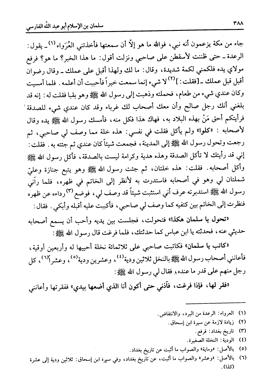 جاء من مكة يزعمون أنه نبي فوالله ما هو إلا أن سمعتها فأخذتني العرواء (1) يقول الرعدة حتى ظننت لأسقطن على صاحبي ونزلت أقول ما هذا الخبر ما هو فرفع مولاي يده فلكمني لكمة شديدة وقال ما لك ولهذا أقبل على عملك وقال رضوان أقبل قبل عملك فقلت (2) لا شئ إنما سمعت خبرا فأحببت أن أعلمه فلما أمسيت وكان عندي شئ من طعام فحملته وذهبت إلى رسول الله (صلى الله عليه وسلم) وهو بقبا فقلت له إنه قد بلغني أنك رجل صالح وأن معك أصحاب لك غرباء وقد كان عندي شئ للصدقة فرأيتكم أحق من بهذه البلاد به فهاك هذا فكل منه فأمسك رسول الله (صلى الله عليه وسلم) يده وقال لأصحابه كلوا ولم يأكل فقلت في نفسي هذه خلة مما وصف لي صاحبي ثم رجعت وتحول رسول الله (صلى الله عليه وسلم) إلى المدينة فجمعت شيئا كان عندي ثم جئته به فقلت إني قد رأيتك لا تأكل الصدقة وهذه هدية وكرامة ليست بالصدقة فأكل رسول الله (صلى الله عليه وسلم) وأكل أصحابه فقلت هذه خلتان ثم جئت رسول الله (صلى الله عليه وسلم) وهو يتبع جنازة وعلي شملتان لي وهو في أصحابه فاستدرت به لأنظر إلى الخاتم في ظهره فلما رآني رسول الله (صلى الله عليه وسلم) استدبرته عرف أني استثبت شيئا قد وصف لي فوضع (3) رداء عن ظهره فنظرت إلى الخاتم بين كتفيه كما وصف لي صاحبي فأكببت عليه أقبله وأبكي فقال تحول يا سلمان هكذا فتحولت فجلست بين يديه وأحب أن يسمع أصحابه حديثي عنه فحدثته يا ابن عباس كما حدثتك فلما فرغت قال رسول الله (صلى الله عليه وسلم) كاتب يا سلمان فكاتبت صاحبي على ثلاثمائة نخلة أحييها له وأربعين أوقية فأعانني أصحاب رسول الله (صلى الله عليه وسلم) بالنخل ثلاثين ودية (4) وعشرين ودية (5) وعشرا (6) كل رجل منهم على قدر ما عنده فقال لي رسول الله (صلى الله عليه وسلم) فقر لها فإذا فرغت فأذاني حتى أكون أنا الذي أضعها بيدي ففقرتها وأعانني