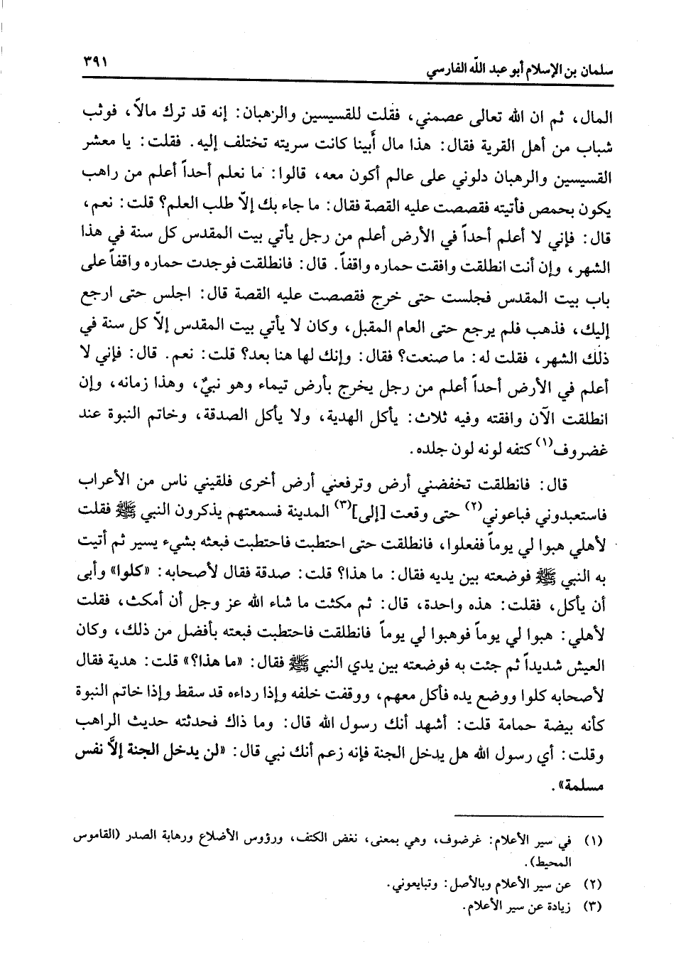 المال ثم إن الله تعالى عصمني فقلت للقسيسين والرهبان إنه قد ترك مالا فوثب شباب من أهل القرية فقال هذا مال أبينا كانت سريته تختلف إليه فقلت يا معشر القسيسين والرهبان دلوني على عالم أكون معه قالوا ما نعلم أحدا أعلم من راهب يكون بحمص فأتيته فقصصت عليه القصة فقال ما جاء بك إلا طلب العلم قلت نعم قال فإني لا أعلم أحدا في الأرض أعلم من رجل يأتي بيت المقدس كل سنة في هذا الشهر وإن أنت انطلقت وافقت حماره واقفا قال فانطلقت فوجدت حماره واقفا على باب بيت المقدس فجلست حتى خرج فقصصت عليه القصة قال اجلس حتى ارجع إليك فذهب فلم يرجع حتى العام المقبل وكان لا يأتي بيت المقدس إلا كل سنة في ذلك الشهر فقلت له ما صنعت فقال وإنك لها هنا بعد قلت نعم قال فإني لا أعلم في الأرض أحدا أعلم من رجل يخرج بأرض تيماء وهو نبي وهذا زمانه وإن انطلقت الآن وافقته وفيه ثلاث يأكل الهدية ولا يأكل الصدقة وخاتم النبوة عند غضروف (1) كتفه لونه لون جلده قال فانطلقت تخفضني أرض وترفعني أرض أخرى فلقيني ناس من الأعراب فاستعبدوني فباعوني (2) حتى وقعت إلى (3) المدينة فسمعتهم يذكرون النبي (صلى الله عليه وسلم) فقلت لأهلي هبوا لي يوما ففعلوا فانطلقت حتى احتطبت فاحتطبت فبعثه بشئ يسير ثم أتيت به النبي (صلى الله عليه وسلم) فوضعته بين يديه فقال ما هذا قلت صدقة فقال لأصحابه كلوا وأبى أن يأكل فقلت هذه واحدة قال ثم مكثت ما شاء الله عز وجل أن أمكث فقلت لأهلي هبوا لي يوما فوهبوا لي يوما فانطلقت فاحتطبت فبعته بأفضل من ذلك وكان العيش شديدا ثم جئت به فوضته بين يدي النبي (صلى الله عليه وسلم) فقال ما هذا قلت هدية فقال لأصحابه كلوا ووضع يده فأكل معهم ووقفت خلفه وإذا رداءه قد سقط وإذا خاتم النبوة كأنه بيضة حمامة قلت أشهد أنك رسول الله قال وما ذاك فحدثته حديث الراهب وقلت أي رسول الله هل يدخل الجنة فإنه زعم أنك نبي قال لن يدخل الجنة إلا نفس مسلمة