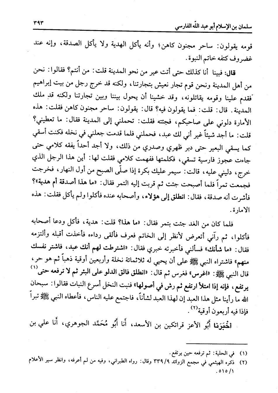 قومه يقولون ساحر مجنون كاهن وأنه يأكل الهدية ولا يأكل الصدقة وإنه عند غضروف كتفه خاتم النبوة قال فبينا أنا كذلك حتى أتت عير من نحو المدينة قلت من أنتم فقالوا نحن من أهل المدينة ونحن قوم تجار نعيش بتجارتنا ولكنه قد خرج رجل من بيت إبراهيم فقدم علينا وقومه يقاتلونه وقد خشينا أن يحول بيننا وبين تجارتنا ولكنه قد ملك المدينة قال قلت فما يقولون فيه قال يقولون ساحر مجنون كاهن فقلت هذه الأمارة دلوني على صاحبكم فجئته فقلت تحملني إلى المدينة فقال ما تعطيني قلت ما أجد شيئا غير أني لك عبد فحملني فلما قدمت جعلني في نخله فكنت أسقي كما يسقي البعير حتى دبر ظهري وصدري من ذلك ولا أجد أحدا يفقه كلامي حتى جاءت عجوز فارسية تسقي فكلمتها ففهمت كلامي فقلت لها أين هذا الرجل الذي خرج دليني عليه قالت سيمر عليك بكرة إذا صلى الصبح من أول النهار فخرجت فجمعت تمرا فلما أصبحت جئت ثم قربت إليه التمر فقال ما هذا أصدقة أم هدية فأشرت أنه صدقة فقال انطلق إلى هؤلاء وأصحابه عنده فأكلوا ولم يأكل فقلت هذه الامارة فلما كان من الغد جئت بتمر فقال ما هذا قلت هدية فأكل ودعا أصحابه فأكلوا رآني أتعرض لأنظر إلى الخاتم فعرف فألقى رداءه فأخذت أقبله وألتزمه فقال ما شأنك فسألني فأخبرته خبري فقال اشترطت لهم أنك عبد فاشتر نفسك منهم فاشتراه النبي (صلى الله عليه وسلم) على أن يحيي له ثلاثمائة نخلة وأربعين أوقية ذهبا ثم هو حر قال النبي (صلى الله عليه وسلم) اغرس فغرس ثم قال انطلق فالق الدلو على البئر ثم لا ترفعه حتى (1) يرتفع فإنه إذا امتلأ ارتفع ثم رش في أصولها فنبت النخل أسرع النباب فقالوا سبحان الله ما رأينا مثل هذا العبد إن لهذا العبد لشأنا فاجتمع عليه الناس فأعطاه النبي (صلى الله عليه وسلم) تبرا فإذا فيه أربعون أوقية (2) أخبرنا أبو الأعز قراتكين بن الأسعد أنا أبو محمد الجوهري أنا علي بن