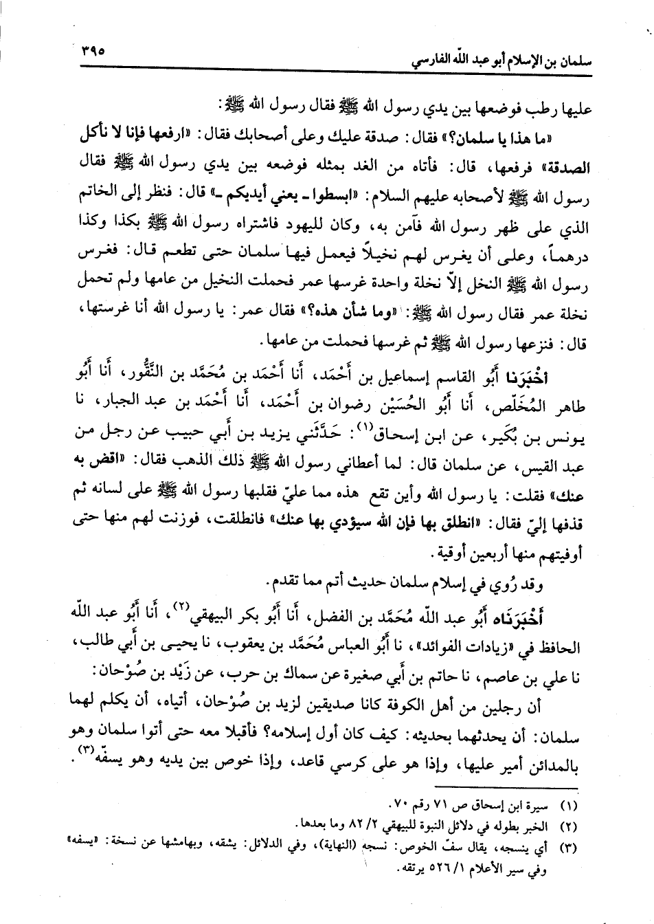 عليها رطب فوضعها بين يدي رسول الله (صلى الله عليه وسلم) فقال رسول الله (صلى الله عليه وسلم) ما هذا يا سلمان فقال صدقة عليك وعلى أصحابك فقال ارفعها فإنا لا نأكل الصدقة فرفعها قال فأتاه من الغد بمثله فوضعه بين يدي رسول الله (صلى الله عليه وسلم) فقال رسول الله (صلى الله عليه وسلم) لأصحابه عليهم السلام ابسطوا يعني أيديكم قال فنظر إلى الخاتم الذي على ظهر رسول الله فآمن به وكان لليهود فاشتراه رسول الله (صلى الله عليه وسلم) بكذا وكذا درهما وعلى أن يغرس لهم نخيلا فيعمل فيها سلمان حتى تطعم قال فغرس رسول الله (صلى الله عليه وسلم) النخل إلا نخلة واحدة غرسها عمر فحملت النخيل من عامها ولم تحمل نخلة عمر فقال رسول الله (صلى الله عليه وسلم) وما شأن هذه فقال عمر يا رسول الله أنا غرستها قال فنزعها رسول الله (صلى الله عليه وسلم) ثم غرسها فحملت من عامها أخبرنا أبو القاسم إسماعيل بن أحمد أنا أحمد بن محمد بن النقور أنا أبو طاهر المخلص أنا أبو الحسين رضوان بن أحمد أنا أحمد بن عبد الجبار نا يونس بن بكير عن ابن إسحاق (1) حدثني يزيد بن أبي حبيب عن رجل من عبد القيس عن سلمان قال لما أعطاني رسول الله (صلى الله عليه وسلم) ذلك الذهب فقال اقض به عنك فقلت يا رسول الله وأين تقع هذه مما علي فقبلها رسول الله (صلى الله عليه وسلم) على لسانه ثم قذفها إلي فقال انطلق بها فإن الله سيؤدي بها عنك فانطلقت فوزنت لهم منها حتى أوفيتهم منها أربعين أويقة وقد روي في إسلام سلمان حديث أتم مما تقدم أخبرناه أبو عبد الله محمد بن الفضل أنا أبو بكر البيهقي (2) أنا أبو عبد الله الحافظ في زيادات الفوائد نا أبو العباس محمد بن يعقوب نا يحيى بن أبي طالب نا علي بن عاصم نا حتم بن أبي صغيرة عن سماك بن حرب عن زيد بن صوحان أن رجلين من أهل الكوفة كانا صديقين لزيد بن صوحان أتياه أن يكلم لهما سلمان أن يحدثهما بحديثه كيف كان أول إسلامه فأقبلا معه حتى أتوا سلمان وهو بالمدائن أمير عليها وإذا هو على كرسي قاعد وإذا خوص بين يديه وهو يسفه (3)