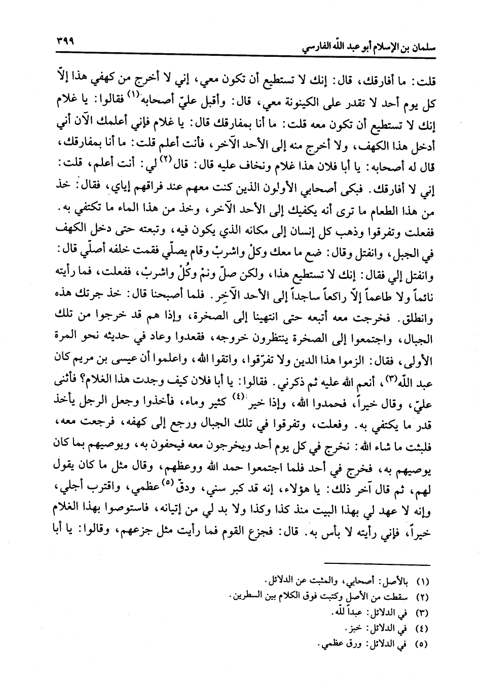 قلت ما أفارقك قال إنك لا تستطيع أن تكون معي إني لا أخرج من كهفي هذا إلا كل يوم أحد لا تقدر على الكينونة معي قال وأقبل علي أصحابه (1) فقالوا يا غلام إنك لا تستطيع أن تكون معه قلت ما أنا بمفارقك قال يا غلام فإني أعلمك الآن أني أدخل هذا الكهف ولا أخرج منه إلى الأحد الآخر فأنت أعلم قلت ما أنا بمفارقك قال له أصحابه يا أبا فلان هذا غلام ونخاف عليه قال قال (2) لي أنت أعلم قلت أني لا أفارقك فبكى أصحابي الأولون الذين كنت معهم عند فراقهم إياي فقال خذ من هذا الطعام ما ترى أنه يكفيك إلى الأحد الآخر وخذ من هذا الماء ما تكتفي به ففعلت وتفرقوا وذهب كل إنسان إلى مكانه الذي يكون فيه وتبعته حتى دخل الكهف في الجبل وانفتل وقال ضع ما معك وكل واشرب وقام يصلي فقمت خلفه أصلي قال وانفتل إلي فقال إنك لا تستطيع هذا ولكن صل ونم وكل واشرب ففعلت فما رأيته نائما ولا طاعما إلا راكعا ساجدا إلى الأحد الآخر فلما أصبحنا قال خذ جرتك هذه وانطلق فخرجت معه أتبعه حتى انتهينا إلى الصخرة وإذا هم قد خرجوا من تلك الجبال واجتمعوا إلى الصخرة ينتظرون خروجه فقعدوا وعاد في حديثه نحو المرة الأولى فقال الزموا هذا الدين ولا تفرقوا واتقوا الله واعلموا أن عيسى بن مريم كان عبد الله (3) أنعم الله عليه ثم ذكرني فقالوا يا أبا فلان كيف وجدت هذا الغلام فأثنى علي وقال خيرا فحمدوا الله وإذا خير (4) كثير وماء فأخذوا وجعل الرجل يأخذ قدر ما يكتفي به وفعلت وتفرقوا في تلك الجبال ورجع إلى كهفه فرجعت معه فلبثت ما شاء الله نخرج في كل يوم أحد ويخرجون معه فيحفون به ويوصيهم بما كان يوصيهم به فخرج في أحد فلما اجتمعوا حمد الله ووعظهم وقال مثل ما كان يقول لهم ثم قال آخر ذلك يا هؤلاء إنه قد كبر سني ودق (5) عظمي واقترب أجلي وإنه لا عهد لي بهذا البيت منذ كذا وكذا ولا بد لي من إتيانه فاستوصوا بهذا لغلام خيرا فإني رأيته لا بأس به قال فجزع القوم فما رأيت مثل جزعهم وقالوا يا أبا