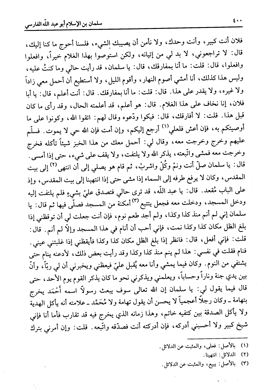 فلان أنت كبير وأنت وحدك ولا نأمن أن يصيبك الشئ فلسنا أحوج ما كنا إليك قال لا تراجعوني لا بد لي من إتيانه ولكن استوصوا بهذا الغلام خيرا وافعلوا وافعلوا قال قلت ما أنا بمفارقك قال يا سلمان قد رأيت حالي وما كنت عليه وليس هذا كذلك أنا أمشي أصوم النهار وأقوم الليل ولا أستطيع أن أحمل معي زادا ولا غيره ولا يقدر على هذا قال قلت ما أنا بمفارقك قال أنت أعلم قال يا أبا فلان إنا نخاف على هذا الغلام قال هو أعلم قد أعلمته الحال وقد رأى ما كان قبل هذا قلت لا أفارقك قال فبكوا ودعوه وقال لهم اتقوا الله وكونوا على ما أوصيتكم به فإن أعش فلعلي أرجع إليكم وإن أمت فإن الله حي لا يموت فسلم عليهم وخرج وخرجت معه وقال لي أحمل معك من هذا الخبز شيئا تأكله فخرج وخرجت معه فمشى واتبعته يذكر الله ولا يلتفت ولا يقف على شئ حتى إذا أمسى قال يا سلمان صل أنت ونم وكل واشرب ثم قام هو يصلي إلى أن انتهى (2) إلى بيت المقدس وكان لا يرفع طرفه إلى السماء إذا مشى حتى إذا انتهينا إلى بيت المقدس وإذ على الباب مقعد قال يا عبد الله قد ترى حالي فتصدق علي بشئ فلم يلتفت إليه ودخل المسجد ودخلت معه فجعل يتتبع (3) أمكنة من المسجد فصلى فيها ثم قال يا سلمان إني لم أنم منذ كذا وكذا ولم أجد طعم نوم فإن أنت جعلت لي أن توقظني إذا بلغ الظل مكان كذا وكذا نمت فإني أحب أن أنام في هذا المسجد وإلا لم أنم قال قلت فإني أفعل قال فانظر إذا بلغ الظل مكان كذا وكذا فأيقظني إذا غلبتني عيني فنام فقلت في نفسي هذا لم ينم منذ كذا وكذا وقد رأيت بعض ذلك لأدعنه ينام حتى يشتفي من النوم وكان فيما يمشي وأنا معه يقبل علي فيعظني ويخبرني أن لي ربا وأن بين يدي جنة ونارا وحسابا ويعلمني ويذكرني نحو ما كان يذكر القوم يوم الأحد حتى قال فيما يقول لي يا سلمان إن الله تعالى سوف يبعث رسولا اسمه أحمد يخرج بتهامة وكان رجلا أعجميا لا يحسن أن يقول تهامة ولا محمد علامته أنه يأكل الهدية ولا يأكل الصدقة بين كتفيه خاتم وهذا زمانه الذي يخرج فيه قد تقارب فأما أنا فإني شيخ كبير ولا أحسبني أدركه فإن أدركته أنت فصدقه واتبعه قلت وإن أمرني بترك