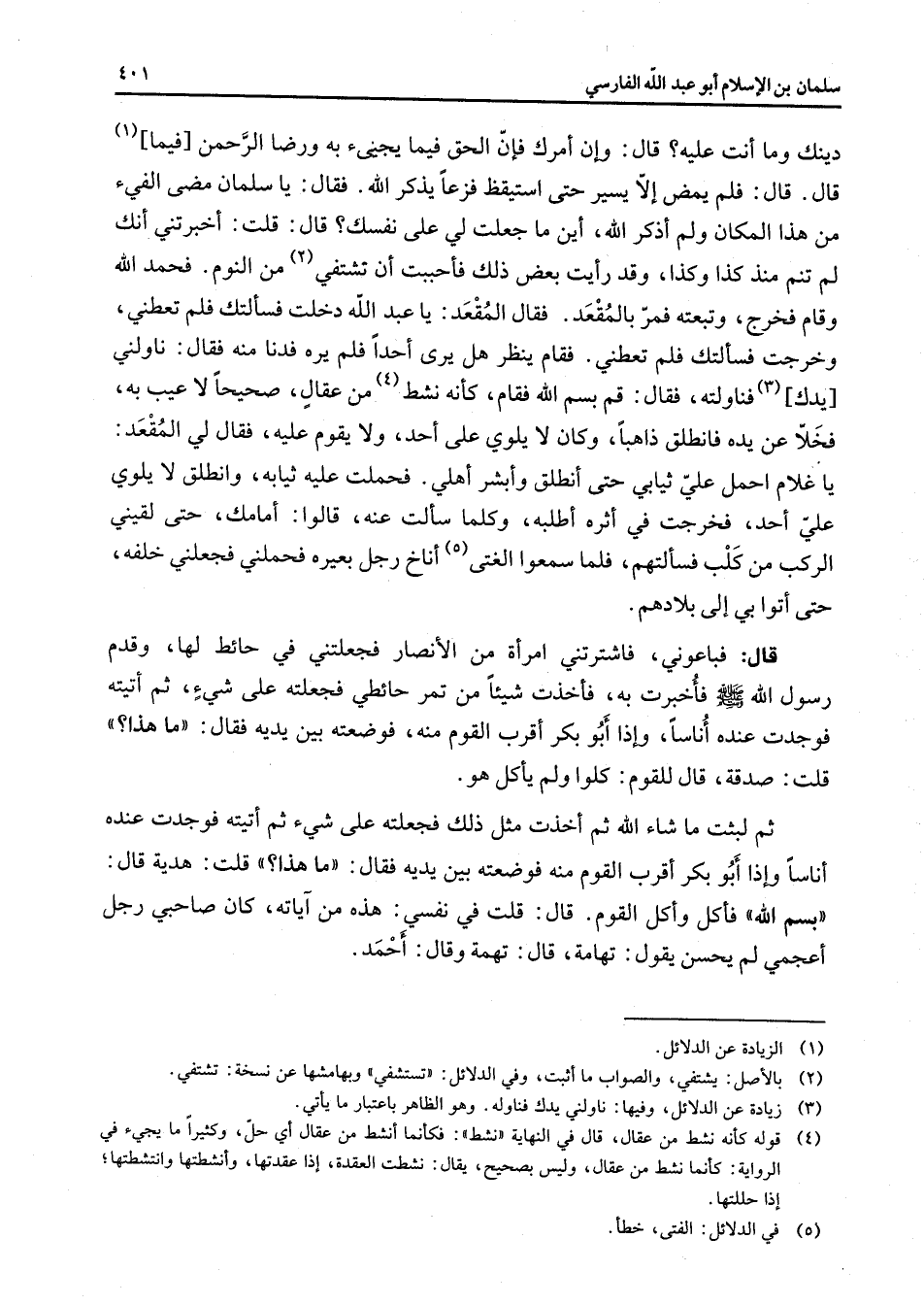دينك وما أنت عليه قال وإن أمرك فإن الحق فيما يجيئ به ورضا الرحمن فيما (1) قال قال فلم يمض إلا يسير حتى استيقظ فزعا يذكر الله فقال يا سلمان مضى الفئ من هذا المكان ولم أذكر الله أين ما جعلت لي على نفسك قال قلت أخبرتني أنك لم تنم منذ كذا وكذا وقد رأيت بعض ذلك فأحببت أن تشتفي (2) من النوم فحمد الله وقام فخرج وتبعه فمر بالمقعد فقال المقعد يا عبد الله دخلت فسألتك فلم تعطني وخرجت فسألتك فلم تعطني فقام ينظر هل يرى أحدا فلم يره فدنا منه فقال ناونلي يدك (3) فناولته فقال قم بسم الله فقام كأنه نشط (4) من عقال صحيحا لا عيب به فخلا عن يده فانطلق ذاهبا وكان لا يلوي على أحد ولا يقوم عليه فقال لي المقعد يا غلام احمل علي ثيابي حتى أنظلق وأبشر أهلي فحملت عليه ثيابه وانطلق لا يلوي علي أحد فخرجت في أثره أطلبه وكلما سألت عنه قالوا أمامك حتى لقيني الركب من كلب فسألتهم فلما سمعوا الغتى (5) أناخ رجل بعيره فحملني فجعلني خلفه حتى أتوا بي إلى بلادهم قال فباعوني فاشترتني امرأة من الأنصار فجعلتني في حائط لها وقدم رسول الله (صلى الله عليه وسلم) فأخبرت به فأخذت شيئا من تمر حائطي فجعلته على شئ ثم أتيته فوجدت عنده أناسا وإذا أبو بكر القوم منه فوضعته بين يديه فقال ما هذا قلت صدقة قال للقوم كلوا ولم يأكل هو ثم لبثت ما شاء الله ثم أخذت مثل ذلك فجعلته على شئ ثم أتيته فوجدت عنده أناسا وإذا أبو بكر أقرب القوم منه فوضعته بين يديه فقال ما هذا قلت هدية قال بسم الله فأكل وأكل القوم قال قلت في نفسي هذه من آياته كان صاحبي رجل أعجمي لم يحسن يقول تهامة قال تهمة وقال أحمد