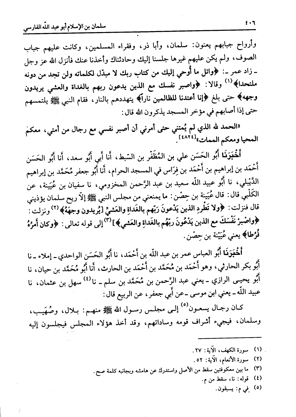 وأرواح جبابهم يعنون سلمان وأبا ذر وفقراء المسلمين وكانت عليهم جباب الصوف ولم يكن عليهم غيرها جلسنا إليك وحادثناك وأخذنا عنك فأنزل الله عز وجل زاد عمر " واتل ما أوحي إليك من كتاب ربك لا مبدل لكلماته ولن تجد من دونه ملتحدا (1) " وقالا " واصبر نفسك مع الذين يدعون ربهم بالغداة والعشي يريدون وجهه " حتى بلغ " إنا اعتدنا للظالمين نارا " يتهددهم بالنار فقام النبي (صلى الله عليه وسلم) يلتمسهم حتى إذا أصابهم في مؤخر المسجد يذكرون الله قال الحمد لله الذي لم يمتني حتى أمرني أن أصبر نفسي مع رجال من أمتي معكم المحيا ومعكم الممات أخبرنا أبو الحسن علي بن المظفر بن السبط أنا أبي أبو سعد أنا أبو الحسن أحمد بن إبراهيم بن أحمد بن فراس في المسجد الحرام أنا أبو جعفر محمد بن إبراهيم الديبلي نا أبو عبيد الله سعيد بن عبد الرحمن المخزومي نا سفيان بن عيينة عن الكلبي قال قال عيينة بن حصن ما يمنعني من مجلس النبي (صلى الله عليه وسلم) إلا ريح سلمان يؤذيني قال فنزلت " ولا تطرد الذين يدعون ربهم بالغداة والعشي يريدون وجهه (2) " ونزلت " واصبر نفسك مع الذين يدعون ربهم بالغداة والعشي (3) " إلى قوله تعالى " وكان أمره فرطا " يعني عيينة بن حصن أخبرنا أبو العباس عمر بن عبد الله بن أحمد نا أبو الحسن الواحدي إملاء نا أبو بكر الحارثي وهو أحمد بن محمد بن أحمد بن الحارث أنا أبو محمد بن حيان نا أبو يحيى الرازي يعني عبد الرحمن بن محمد بن سلم نا (4) سهل بن عثمان نا عبيد الله يعني ابن موسى عن أبي جعفر عن الربيع قال كان رجال يسعون (5) إلى مجلس رسول الله (صلى الله عليه وسلم) منهم بلال وصهيب وسلمان فيجئ أشراف قومه وساداتهم وقد أخذ هؤلاء المجلس فيجلسون إليه