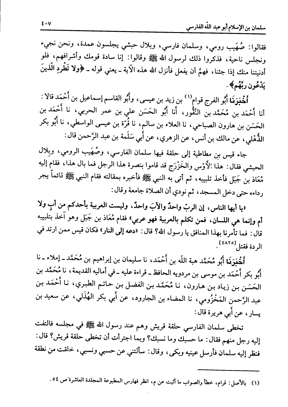 فقالوا صهيب رومي وسلمان فارسي وبلال حبشي يجلسون عمدة ونحن نجئ ونجلس ناحية فذكروا ذلك لرسول الله (صلى الله عليه وسلم) وقالوا إنا سادة قومك وأشرافهم فلو أدنيتنا منك إذا جئنا فهم أن يفعل فأنزل الله هذه الآية يعني قوله " ولا تطرد الذين يدعون ربهم " أخبرنا أبو الفرج قوام (1) بن زيد بن عيسى وأبو القاسم إسماعيل بن أحمد قالا أنا أحمد بن محمد بن النقور أنا أبو الحسن علي بن عمر الحربي نا أحمد بن الحسن بن هارون الصباحي نا العلاء بن سالم نا قرة بن عيسى الواسطي نا أبو بكر الدهلي عن مالك بن أنس عن الزهري عن أبي سلمة بن عبد الرحمن قال جاء قيس بن مطاطية إلى حلقة فيها سلمان الفارسي وصهيب الرومي وبلال الحبشي فقال هذا الأوس والخزرج قد قاموا بنصرة هذا الرجل فما بال هذا فقام إليه معاذ بن جبل فأخذ تلبيبه ثم أتى به النبي (صلى الله عليه وسلم) فأخبره بمقالته فقام النبي (صلى الله عليه وسلم) قائما يجر رداءه حتى دخل المسجد ثم نودي أن الصلاة جامعة وقال يا أيها الناس إن الرب واحد والأب واحد وليست العربية بأحدكم من أب ولا أم وإنما هي اللسان فمن تكلم بالعربية فهو عربي فقام معاذ بن جبل وهو آخذ بتلبيبه قال فما تأمرنا بهذا المنافق يا رسول الله قال دعه إلى النار فكان قيس ممن ارتد في الردة فقتل أخبرنا أبو محمد هبة الله بن أحمد نا سليمان بن إبراهيم بن محمد إملاء نا أبو بكر أحمد بن موسى بن مردويه الحافظ قراءة عليه في أماليه القديمة نا محمد بن الحسن بن زياد بن هارون نا محمد بن الفضل بن حاتم الطبري نا أحمد بن عبد الرحمن المخزومي نا المضاء بن الجارود عن أبي بكر الهذلي عن سعيد بن يسار عن أبي هريرة قال تخطى سلمان الفارسي حلقة قريش وهم عند رسول الله (صلى الله عليه وسلم) في مجلسه فالتفت إليه رجل منهم فقال ما حسبك وما نسبك وبما اجترأت أن تخطى حلقة قريش قال فنظر إليه سلمان فأرسل عينيه وبكى وقال سألتني عن حسبي ونسبي خلقت من نطقة