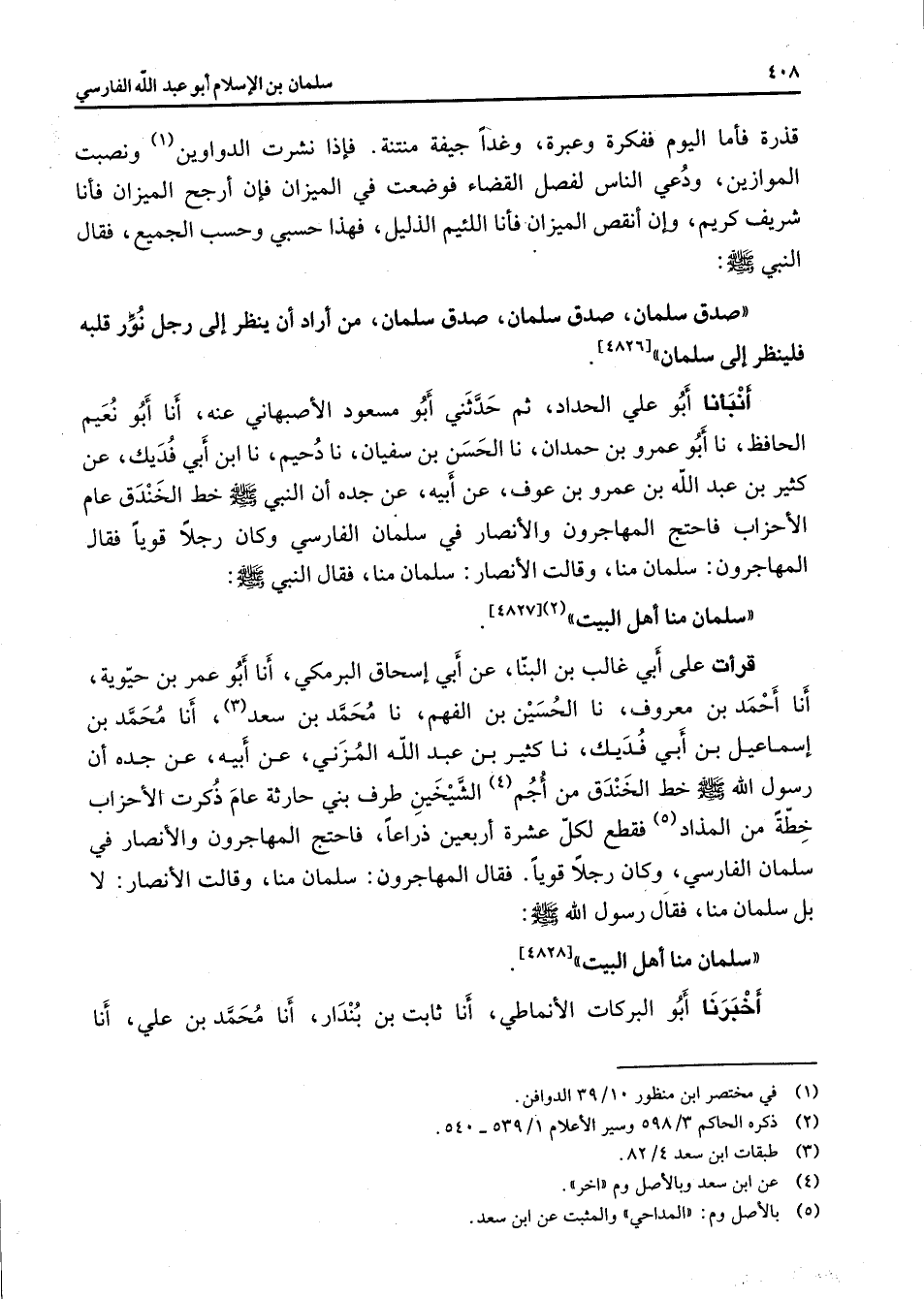قذرة فأما اليوم ففكرة وعبرة وغدا جيفة منتنة فإذا نشرت الدواوين (1) ونصبت الموازين ودعي الناس لفصل القضاء فوضعت في الميزان فإن أرجح الميزان فأنا شريف كريم وإن أنقص الميزان فأنا اللئيم الذليل فهذا حسبي وحسب الجميع فقال النبي (صلى الله عليه وسلم) صدق سلمان صدق سلمان صدق سلمان من أراد أن ينظر إلى رجل نور قلبه فلينظر إلى سلمان أنبأنا أبو علي الحداد ثم حدثني أبو مسعود الأصبهاني عنه أنا أبو نعيم الحافظ نا أبو عمرو بن حمدان نا الحسن بن سفيان نا دحيم نا بن أبي فديك عن كثير بن عبد الله بن عمرو بن عوف عن أبيه عن جده أن النبي (صلى الله عليه وسلم) خط الخندق عام الأحزاب فاحتج المهاجرون والأنصار في سلمان الفارسي وكان رجلا قويا فقال المهاجرون سلمان منا وقالت الأنصار سلمان منا فقال النبي (صلى الله عليه وسلم) سلمان منا أهل البيت قرأت على أبي غالب ابن البنا عن أبي إسحاق البرمكي أنا أبو عمر بن حيوية أنا أحمد بن معروف نا الحسين بن الفهم نا محمد بن سعد (3) أنا محمد بن إسماعيل بن أبي فديك نا كثير بن عبد الله المزني عن أبيه عن جده أن رسول الله (صلى الله عليه وسلم) خط الخندق من أجم (4) الشيخين طرف بني حارثة عام ذكرت الأحزاب خطة من المذاد (5) فقطع لكل عشرة أربعين ذراعا فاحتج المهاجرون والأنصار في سلمان الفارسي وكان رجلا قويا فقال المهاجرون سلمان منا وقالت الأنصار لا بل سلمان منا فقال رسول الله (صلى الله عليه وسلم) سلمان منا أهل البيت أخبرنا أبو البركات الأنماطي أنا ثابت بن بندار أنا محمد بن علي أنا