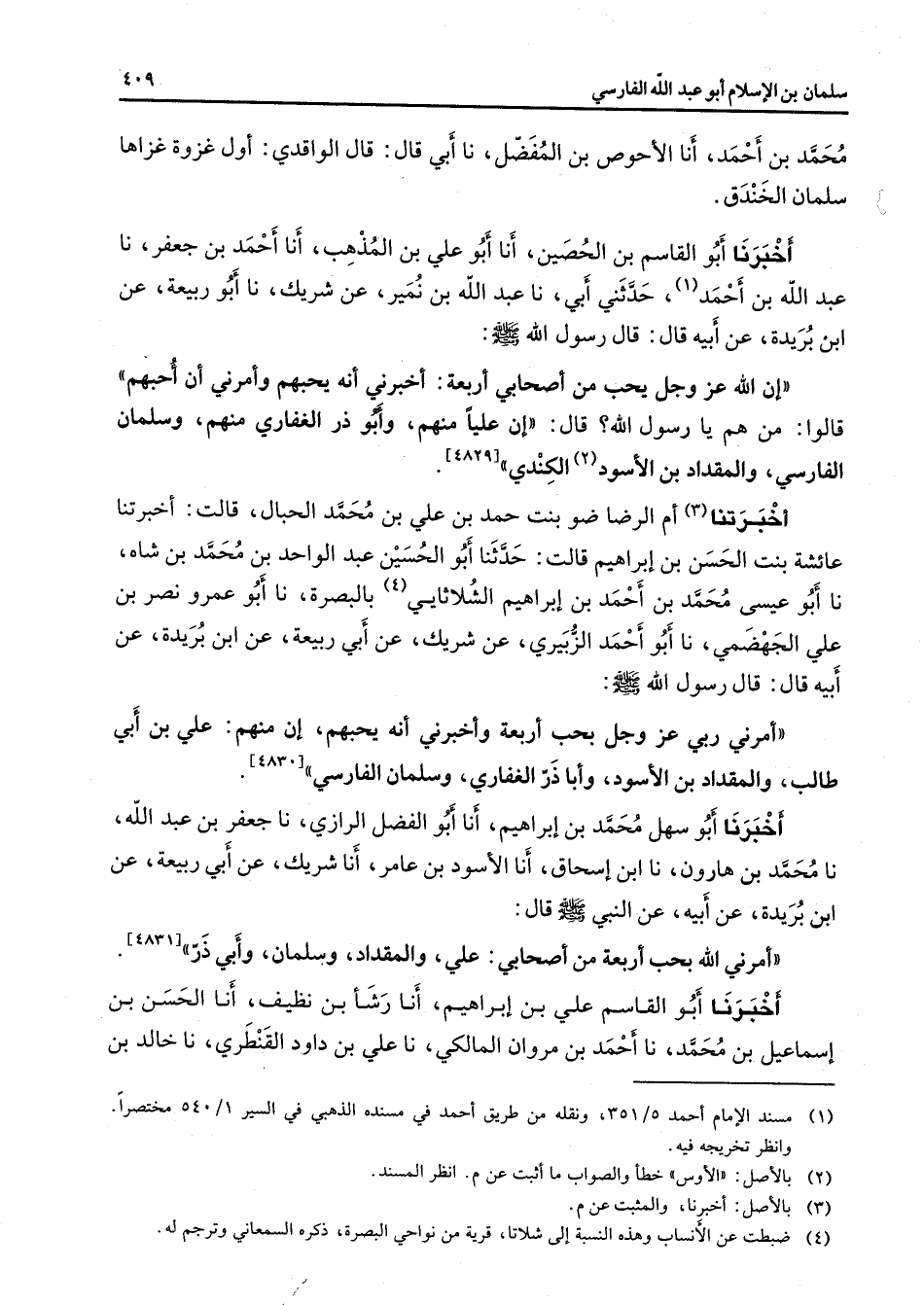 محمد بن أحمد أنا الأحوص بن المفضل نا أبي قال قال الواقدي أول غزوة غزاها سلمان الخندق أخبرنا أبو القاسم بن الحصين أنا أبو علي بن المذهب أنا أحمد بن جعفر نا عبد الله بن أحمد (1) حدثني أبي نا عبد الله بن نمير عن شريك نا أبو ربيعة عن ابن بريدة عن أبيه قال قال رسول الله (صلى الله عليه وسلم) إن الله عز وجل يحب من أصحابي أربعة أخبرني أنه يحبهم وأمرني أن أحبهم قالوا من هم يا رسول الله قال إن عليا منهم وأبو ذر الغفاري منهم وسلمان الفارسي والمقداد بن الأسود (2) الكندي أخبرتنا (3) أم الرضا ضو بنت حمد بن علي بن محمد الحبال قالت أخبرتنا عائشة بنت الحسن بن إبراهيم قالت حدثنا أبو الحسين عبد الواحد بن محمد بن شاه نا أبو عيسى محمد بن أحمد بن إبراهيم الشلاثايي (4) بالبصرة نا أبو عمرو نصر بن علي الجهضمي نا أبو أحمد الزبيري عن شريك عن أبي ربيعة عن ابن بريدة عن أبيه قال قال رسول الله (صلى الله عليه وسلم) أمرني ربي عز وجل بحب أربعة وأخبرني أنه يحبهم إن منهم علي بن أبي طالب والمقداد بن الأسود وأبا ذر الغفاري وسلمان الفارسي أخبرنا أبو سهل محمد بن إبراهيم أنا أبو الفضصل الرازي نا جعفر بن عبد الله نا محمد بن هارون نا ابن إسحاق أنا الأسود بن عامر أنا شريك عن أبي ربيعة عن ابن بريدة عن أبيه عن النبي (صلى الله عليه وسلم) قال أمرني الله بحب أربعة من أصحابي علي والمقداد وسلمان وأبي ذر أخبرنا أبو القاسم علي بن إبراهيم أنا رشأ بن نظيف أنا الحسن بن إسماعيل بن محمد نا أحمد بن مروان المالكي نا علي بن داود القنطري نا خالد بن