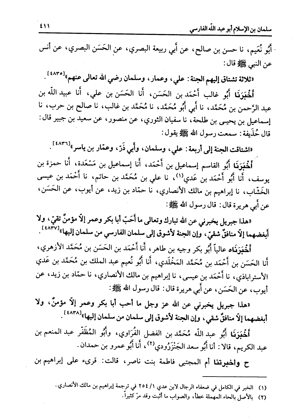 أبو نعيم نا حسن بن صالح عن أبي ربيعة البصري عن الحسن البصري عن أنس عن النبي (صلى الله عليه وسلم) قال ثلاثة تشتاق إليهم الجنة علي وعمار وسلمان رضي الله تعالى عنهم أخبرنا أبو غالب أحمد بن الحسن أنا الحسن بن علي أنا عبيد الله بن عبد الرحمن بن محمد نا أبي أبو محمد نا محمد بن غالب نا صالح بن حرب نا إسماعيل بن يحيى بن طلحة نا سفيان الثوري عن منصور عن سعيد بن جبير قال قال حذيفة سمعت رسول الله (صلى الله عليه وسلم) يقول اشتاقت الجنة إلى أربعة علي وسلمان وأبي ذر وعمار بن ياسر أخبرنا أبو القاسم إسماعيل بن أحمد أنا إسماعيل بن مسعدة أنا حمزة بن يوسف أنا أبو أحمد بن عدي (1) ناعلي بن محمد بن حاتم نا أحمد بن عيسى الخشاب نا إبراهيم بن مالك الأنصاري نا حماد بن زيد عن أيوب عن الحسن عن أبي هريرة قال قال رسول الله (صلى الله عليه وسلم) هذا جبريل يخبرني عن الله تبارك وتعالى ما أحب أبا بكر وعمر إلا مؤمن تقي ولا أبغضهما إلا منافق شقي وإن الجنة لأشوق إلى سلمان الفارسي من سلمان إليها أخبرناه عاليا أبو بكر وجيه بن طاهر أنا أحمد بن الحسن بن محمد الأزهري أنا الحسن بن أحمد بن محمد المخلدي أنا أبو نعيم عبد الملك بن محمد بن عدي الأستراباذي نا أحمد بن عيسى نا إبراهيم بن مالك الأنصاري نا حماد بن زيد عن أيوب عن الحسن عن أبي هريرة قال قال رسول الله (صلى الله عليه وسلم) هذا جبريل يخبرني عن الله عز وجل ما أحب أبا بكر وعمر إلا مؤمن ولا إبغضهما إلا منافق شقي وإن الجنة لأشوق إلى سلمان من سلمان إليها أخبرنا أبو عبد الله محمد بن الفضل الفراوي وأبو المظفر عبد المنعم بن عبد الكريم قالا أنا أبو سعد لجنزرودي (2) أنا أبو عمرو بن حمدان ح وأخبرتنا أم المجتبى فاطمة بنت ناصر قالت قرئ على إبراهيم بن