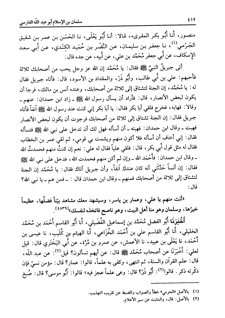 منصور أنا أبو بكر المقرئ قالا أنا أبو يعلى نا الحسن بن عمر بن شقيق الجزمي (1) نا جعفر بن سليمان عن النضر بن حميد الكندي عن أبي سعد الإسكاف عن أبي جعفر محمد بن علي عن أبيه عن جده قال أتى جبريل النبي (صلى الله عليه وسلم) فقال يا محمد إن الله عز وجل يحب من أصحابك ثلاثة فأحبهم علي بن أبي طالب وأبو ذر والمقداد بن الأسود قال فأتاه جبريل فقال له يا محمد إن الجنة لتشتاق إلى ثلاثة من أصحابك وعنده أنس بن مالك فرجا أن يكون لبعض الأنصار قال فأراد أن يسأل رسول الله (صلى الله عليه وسلم) زاد ابن حمدان عنهم وقالا فهابه فخرج فلقي أبا بكر فقال يا أبا بكر إني كنت عند رسول الله (صلى الله عليه وسلم) آنفا فأتاه جبريل فقال إن الجنة تشتاق إلى ثلاثة من أصحابك فرجوت أن يكون لبعض الأنصار فهبت وقال ابن حمدان فهبته أن أسأله فهل لك أن تدخل على نبي الله (صلى الله عليه وسلم) فتسأله فقال إني أخاف أن أسأله فلا أكون منهم ويشمت بي قومي ثم لقي عمر بن الخطاب فقال له مثل قول أبي بكر قال فلقي عليا فقال له علي نعم إن كنت منهم فحمدت الله وقال ابن حمدان فأحمد الله وإن لم أكن منهم فحمدت الله فدخل على نبي الله (صلى الله عليه وسلم) فقال إن أنسا حدثني أنه كان آنفا وأن جبريل أتاك فقال يا محمد إن الجنة لتشتاق إلى ثلاثة من أصحابك فمنهم وقال ابن حمدان قال فمن هم يا نبي الله قال أنت منهم يا علي وعمار بن ياسر وسيشهد معك مشاهد بينا فضلها عظيما خيرها وسلمان وهو منا أهل البيت وهو ناصح فاتخذه لنفسك أخبرناه أبو الفضل محمد بن إسماعيل الفضيلي أنا أبو القاسم أحمد بن محمد الخليلي أنا أبو القاسم علي بن أحمد الخزاعي أنا الهيثم بن كليب نا عيسى بن أحمد نا يعلى بن عبيد نا الأعمش عن عمرو بن مرة عن أبي البختري قال قيل لعلي أخبرنا عن أصحاب محمد (صلى الله عليه وسلم) قال عن أيهم تسألون قيل (2) عن عبد الله قال علم القرآن والسنة ثم انتهى وكفى به علما قالوا عمار قال مؤمن نسي فإن ذكرته ذكر قالوا (2) أبو ذر قال وعى علما عجز فيه قالوا أبو موسى قال صبغ
