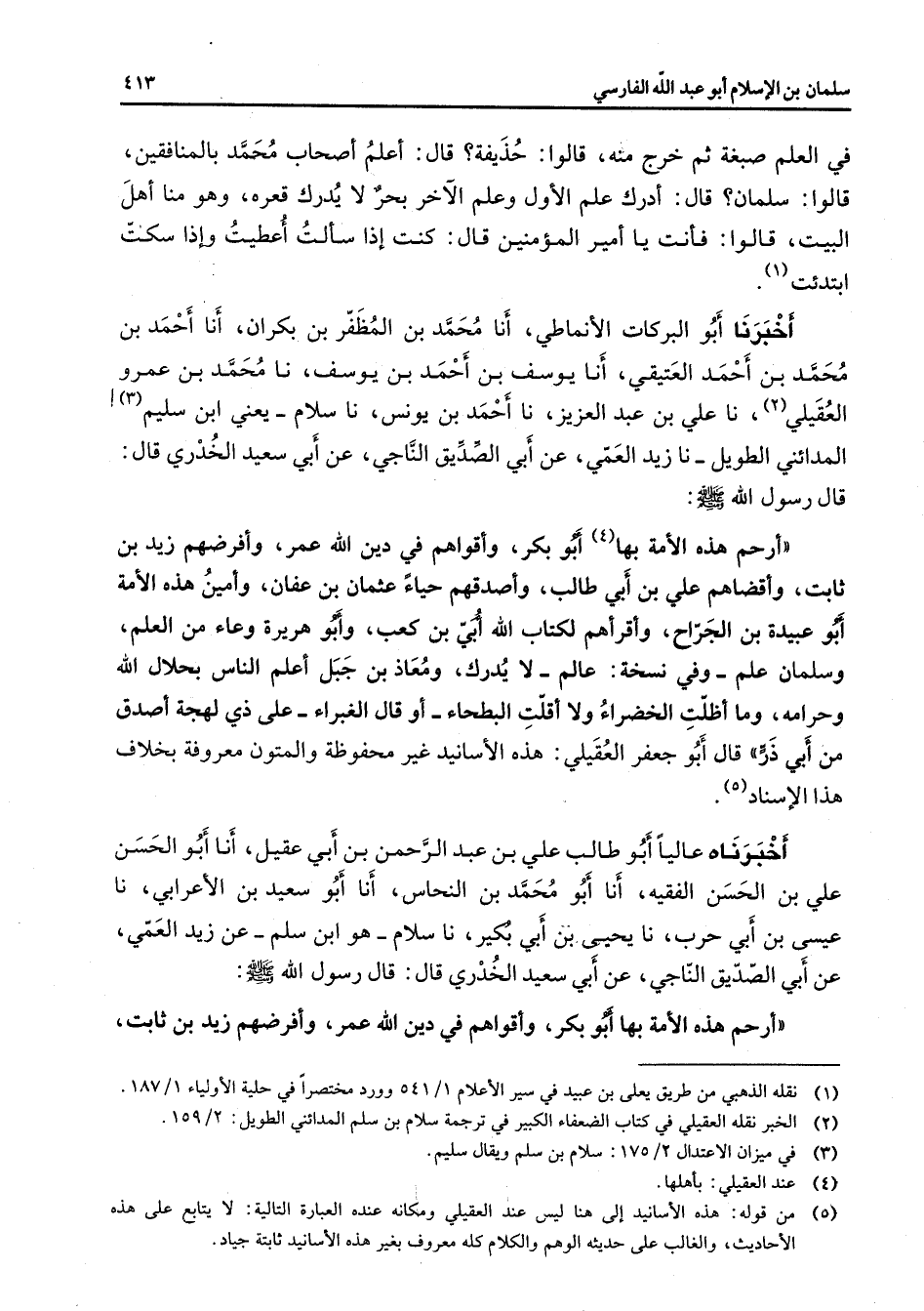 في العلم صبغة ثم خرج منه قالوا حذيفة قال أعلم أصحاب محمد بالمنافقين قالوا سلمان قال أدرك علم الأول وعلم الآخر بحر لا يدرك قعره وهو منا أهل البيت قالوا فأنت يا أمير المؤمنين قال كنت إذا سألت أعطيت وإذا سكنت ابتدئت (1) أخبرنا أبو البركات الأنماطي أنا محمد بن المظفر بن بكران أنا أحمد بن محمد بن أحمد العتيقي أنا يوسف بن أحمد بن يوسف نا محمد بن عمرو العقيلي (2) نا علي بن عبد العزيز نا أحمد بن يونس نا سلام يعني ابن سليم (3) المدائني الطويل نا زيد العمي عن أبي الصديق الناجي عن أبي سعيد الخدري قال قال رسول الله (صلى الله عليه وسلم) أرحم هذه الأمة بها (4) أبو بكر وأقواهم في دين الله عمر وأفرضهم زيد بن ثابت وأقضاهم علي بن أبي طالب وأصدقهم حياء عثمان بن عفان وأمين هذه الأمة أبو عبيدة بن الجراح وأقرأهم لكتاب الله أبي بن كعب وأبو هريرة وعاء من العلم وسلمان علم وفي نسخة عالم لا يدرك ومعاذ بن جبل أعلم الناس بحلال الله وحرامه وما أظلت الخضراء ولا أقلت البطحاء أو قال الغبراء على ذي لهجة أصدق من أبي ذر قال أبو جعفر العقيلي هذه الأسانيد غير محفوظة والمتون معروفة بخلاف هذا الإسناد (5) أخبرناه عاليا أبو طالب علي بن عبد الرحمن بن أبي عقيل أنا أبو الحسن علي بن الحسن الفقيه أنا أبو محمد بن النحاس أنا أبو سعيد بن الأعرابي نا عيسى بن أبي حرب نا يحيى بن أبي بكير نا سلام هو ابن سلم عن زيد العمي عن أبي الصديق الناجي عن أبي سعيد الخدري قال قال رسول الله (صلى الله عليه وسلم) أرحم هذه الأمة بها أبو بكر وأقواهم في دين الله عمر وأفرضهم زيد بن ثابت