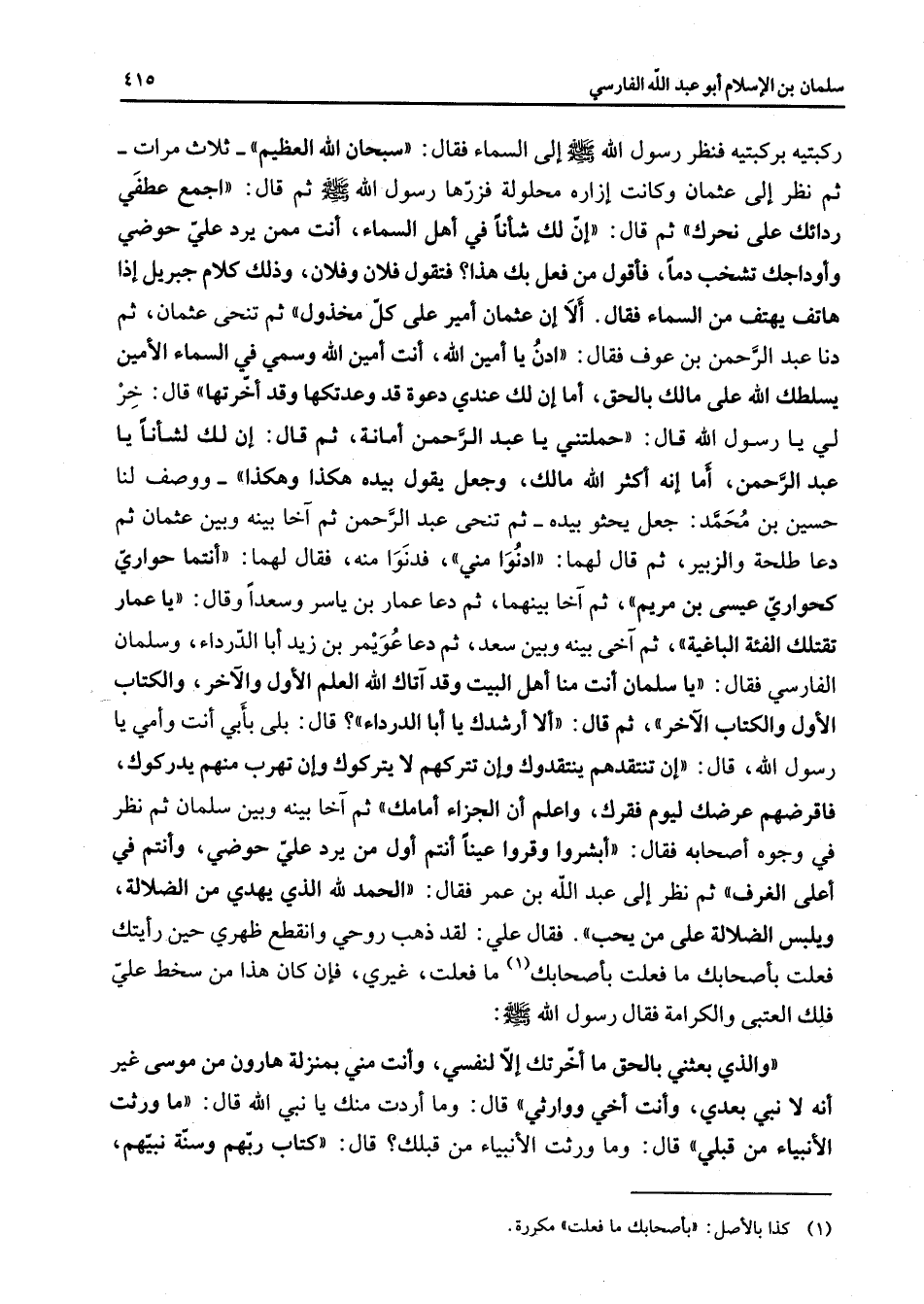 ركبتيه بركبتيه فنظر رسول الله (صلى الله عليه وسلم) إلى السماء فقال سبحان الله العظيم ثلاث مرات ثم نظر إلى عثمان وكانت إزاره محلولة فزرها رسول الله (صلى الله عليه وسلم) ثم قال اجمع عطفي ردائك على نحرك ثم قال إن لك شأنا في أهل السماء أنت ممن يرد علي حوضي وأوداجك تشخب دما فأقول من فعل بك هذا فتقول فلان وفلان وذلك كلام جبريل إذا هاتف يهتف من السماء فقال ألا إن عثمان أمير على كل مخذول ثم تنحى عثمان ثم دنا عبد الرحمن بن عوف فقال ادن يا أمين الله أنت أمين الله وسمي في السماء الأمين يسلطك الله على مالك بالحق أما إن لك عندي دعوة قد وعدتكها وقد أخرتها قال خر لي يا رسول الله قال حملتني يا عبد الرحمن أمانة ثم قال إن لك لشأنا يا عبد الرحمن أما إنه أكثر الله مالك وجعل يقول بيده هكذا وهكذا ووصف لنا حسين بن محمد جعل يحثو بيده ثم تنحى عبد الرحمن ثم آخا بينه وبين عثمان ثم دعا طلحة والزبير ثم قال لهما ادنوا مني فدنوا منه فقال لهما أنتما حواري كحواري عيسى بن مريم ثم آخا بينهما ثم دعا عمار بن ياسر وسعدا وقال يا عمار تقتلك الفئة الباغية ثم آخى بينه وبين سعد ثم دعا عويمر بن زيد أبا الدرداء وسلمان الفارسي فقال يا سلمان أنا منا أهل البيت وقد آتاك الله العلم الأول والآخر والكتاب الأول والكتاب الآخر ثم قال ألا أرشدك يا أبا الدرداء قال بلى بأبي أنت وأمي يا رسول الله قال إن تنتقدهم ينتقدوك وإن تتركهم لا يتركوك وإن تهرب منهم يدركوك فاقرضهم عرضك ليوم فقرك واعلم أن الجزاء أمامك ثم آخا بينه وبين سلمان ثم نظر في وجوه أصحابه فقال أبشروا وقروا عينا أنتم أول من يرد علي حوضي وأنتم في أعلى الغرف ثم نظر إلى عبد الله بن عمر فقال الحمد لله الذي يهدي من الضلالة ويلبس الضلالة على من يحب فقال علي لقد ذهب روحي وانقطع ظهري حين رأيتك فعلت بأصحابك ما فعلت بأصحابك (1) ما فعلت غيري فإن كان هذا من سخط علي فلك العتبى والكرامة فقال رسول الله (صلى الله عليه وسلم) والذي بعثني بالحق ما أخرتك إلا لنفسي وأنت مني بمنزلة هارون من موسى غير أنه لا نبي بعدي وأنت أخي ووارثي قال وما أردت منك يا نبي الله قال ما ورثت الأنبياء من قلبي قال وما ورثت الأنبياء من قبلك قال كتاب ربهم وسنة نبيهم