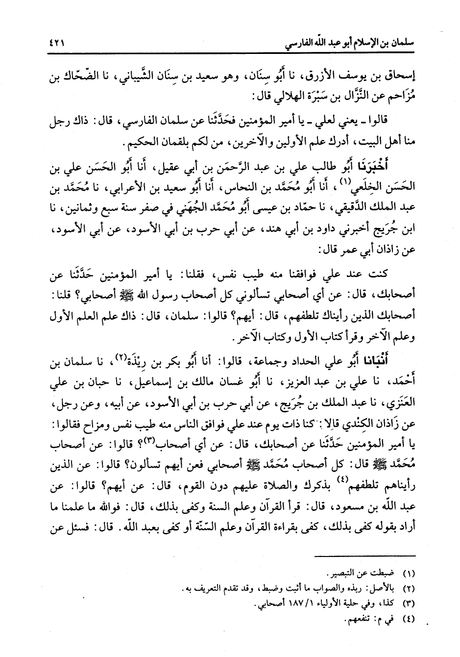 إسحاق بن يوسف الأزرق نا أبو سنان وهو سعيد بن سنان الشيباني نا الضحاك بن مزاحم عن النزال بن سبرة الهلالي قال قالوا يعني لعلي يا أمير المؤمنين فحدثنا عن سلمان الفارسي قال ذاك رجل منا أهل البيت أدرك علم الأولين والآخرين من لكم بلقمان الحكيم أخبرنا أبو طالب علي بن عبد الرحمن بن أبي عقيل أنا أبو الحسن علي بن الحسن الخلعي (1) أنا أبو محمد بن النحاس أنا أبو سعيد بن الأعرابي نا محمد بن عبد الملك الدقيقي نا حماد بن عيسى أبو محمد الجهني في صفر سنة سبع وثمانين نا ابن جريج أخبرني داود بن أبي هند عن أبي حرب بن أبي الأسود عن أبي الأسود عن زاذان أبي عمر قال كنت عند علي فوافقنا منه طيب نفس فقلنا يا أمير المؤمنين حدثنا عن أصحابك قال عن أي أصحابي تسألوني كل أصحاب رسول الله (صلى الله عليه وسلم) أصحابي قلنا اصحابك الذين رأيناك تلطفهم قال أيهم قالوا سلمان قال ذاك علم العلم وعلم الآخر وقرأ كتاب الأول وكتاب الآخر أنبأنا أبو علي الحداد وجماعة قالوا أنا أبو بكر بن ريذة (2) نا سلمان بن أحمد نا علي بن عبد العزيز نا أبو غسان مالك بن إسماعيل نا حبان بن علي العنزي نا عبد الملك بن جريج عن أبي حرب بن أبي الأسود عن أبيه وعن رجل عن زاذان الكندي قالا كنا ذات يوم عند علي فوافق الناس منه طيب نفس ومزاح فقالوا يا أمير المؤمنين حدثنا عن أصحابك قال عن أي أصحاب (3) قالوا عن أصحاب محمد (صلى الله عليه وسلم) قال كل أصحاب محمد (صلى الله عليه وسلم) أصحابي فعن أيهم تسألون قالوا عن الذين رأيناهم تلطفهم بذكرك والصلاة عليهم دون القوم قال عن أيهم قالوا عن عبد الله بن مسعود قال قرأ القرآن وعلم السنة وكفى بذلك قال فوالله ما علمنا ما أراد بقوله كفى بذلك كفى بقراءة القرآن وعلم السنة أو كفى بعبد الله قال فسئل عن