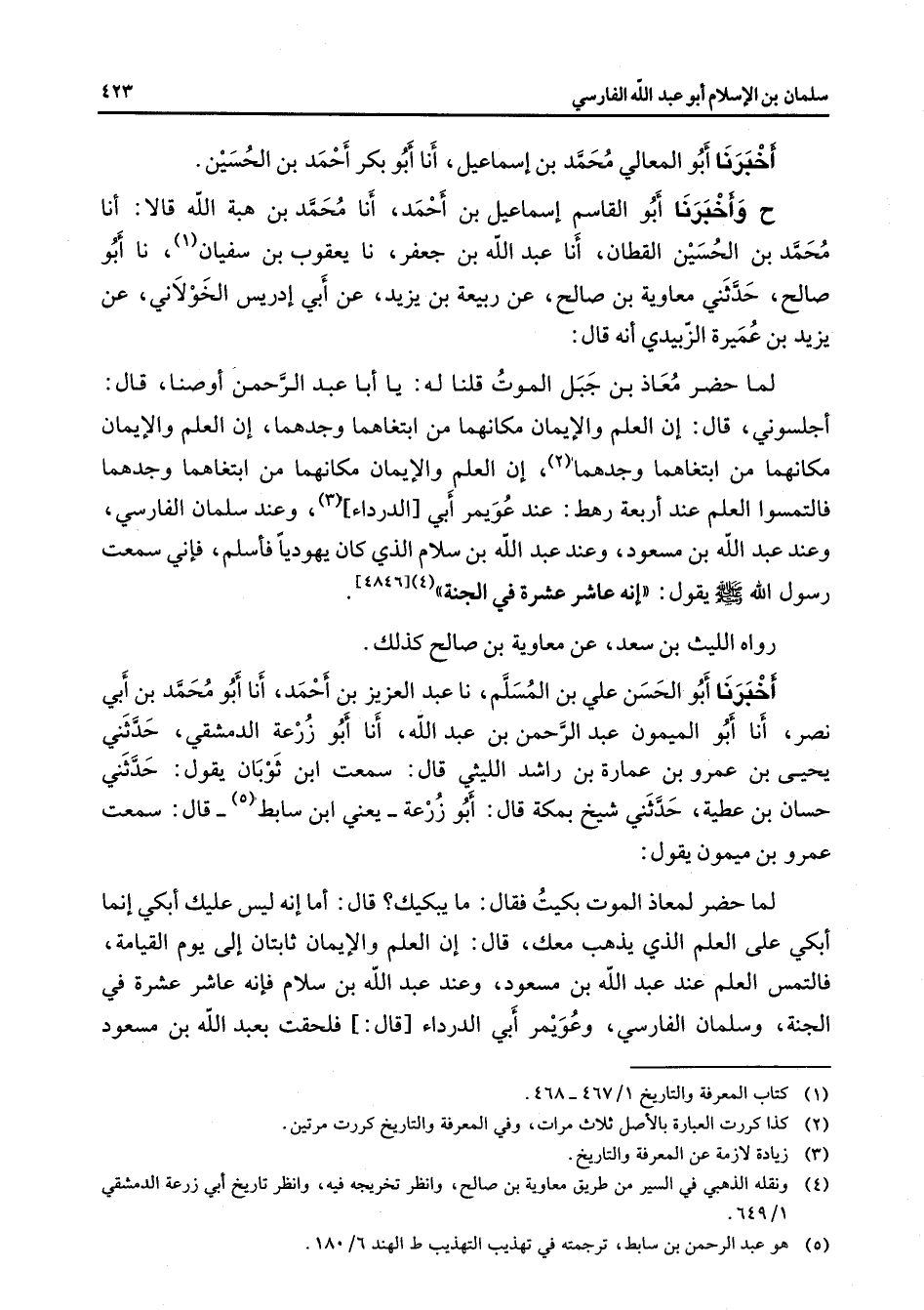 أخبرنا أبو المعالي محمد بن إسماعيل أنا أبو بكر أحمد بن الحسين ح وأخبرنا أبو القاسم إسماعيل بن أحمد أنا محمد بن هبة الله قالا أنا محمد بن الحسين القطان أنا عبد الله بن جعفر نا يعقوب بن سفيان (1) نا أبو صالح حدثني معاوية بن صالح عن ربيعة بن يزيد عن أبي إدريس الخولاني عن يزيد بن عميرة الزبيدي أنه قال لما حضر معاذ بن جبل الموت قلنا له يا أبا عبد الرحمن أوصنا قال أجلسوني قال إن العلم والإيمان مكانهما من ابتغاهما وجدهما إن العلم والإيمان مكانهما من ابتغاهما وجدهما إن العلم والإيمان مكانهما من ابتغاهما وجدهما فالتمسوا العلم عند أربعة رهط عند عويمر أبي الدرداء (3) وعند سلمان الفارسي وعند عبد الله بن مسعود وعند عبد الله بن سلام الذي كان يهوديا فأسلم فإني سمعت رسول الله (صلى الله عليه وسلم) يقول إنه عاشر عشرة في الجنة (4) رواه الليث بن سعد عن معاوية بن صالح كذلك أخبرنا أبو الحسن علي بن المسلم نا عبد العزيز بن أحمد أنا أبو محمد بن أبي نصر أنا أبو الميمون عبد الرحمن بن عبد الله أنا أبو زرعة الدمشقي حدثني يحيى بن عمرو بن عمارة بن راشد الليثي قال سمعت ابن ثوبان يقول حدثني حسان بن عطية حدثني شيخ بمكة قال أبو زرعة يعني ابن سابط (5) قال سمعت عمرو بن ميمون يقول لما حضر لمعاذ الموت بكيت فقال ما يبكيك قال أما إنه ليس عليك أبكي إنما أبكي على العلم الذي يذهب معك قال إن العلم والإيمان ثابتان إلى يوم القيامة فالتمس العلم عند عبد الله بن مسعود وعند عبد الله بن سلام فإنه عاشر عشرة في الجنة وسلمان الفارسي وعويمر أبي الدرداء قال فلحقت بعبد الله بن مسعود