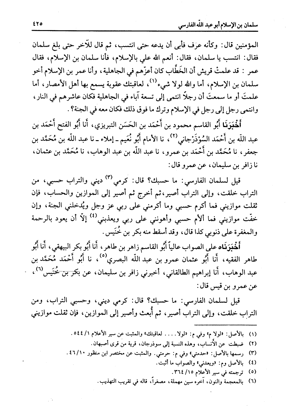 المؤمنين قال وكأنه عرف فأبى أن يدعه حتى انتسب ثم قال للآخر حتى بلغ سلمان فقال انتسب يا سلمان فقال أنعم الله علي بالإسلام فأنا سلمان بن الإسلام فقال عمر قد علمت قريش أن الخطاب كان أعزهم في الجاهلية وأنا عمر بن الإسلام أخو سلمان بن الإسلام أما والله لولا شئ (1) لعاقبتك عقوبة يسمع بها أهل الأمصار أما علمت أو ما سمعت أن رجلا انتمى إلى تسعة آباء في الجاهلية فكان عاشرهم في النار وانتمى رجل إلى رجل في الإسلام وترك ما فوق ذلك فكان معه في الجنة أخبرنا أبو القاسم محمود بن أحمد بن الحسن التبريزي أنا أبو الفتح أحمد بن عبد الله بن أحمد السوذرجاني (2) نا الأمام أبو نعيم إملاء نا عبد الله بن محمد بن جعفر نا محمد بن أحمد بن عمرو نا عبد الله بن عبد الوهاب نا محمد بن عثمان نا زافر بن سليمان عن عمرو قال قيل لسلمان الفارسي ما حسبك قال كرمي (3) ديني والتراب حسبي من التراب خلقت وإلى التراب أصير ثم أخرج ثم أصير إلى الموازين والحساب فإن ثقلت موازيني فما أكرم حسبي وما أكرمني على ربي عز وجل ويدخلني الجنة وإن خفت موازيني فما ألأم حسبي وأهونني على ربي ويعذبني (4) إلا أن يعود بالرحمة والمغفرة على ذنوبي كذا قال وقد أسقط منه بكر بن خنيس أخبرناه على الصواب عاليا أبو القاسم زاهر بن طاهر أنا أبو بكر البيهقي أنا أبو طاهر الفقيه أنا أبو عثمان عمرو بن عبد الله البصري (5) نا أبو أحمد محمد بن عبد الوهاب أنا إبراهيم الطالقاني أخبرني زافر بن سليمان عن بكر بن خنيس عن عمرو بن قيس قال قيل لسلمان الفارسي ما حسبك قال كرمي ديني وحسبي التراب ومن التراب خلفت وإلى التراب أصير ثم أبعث وأصير إلى الموازين فإن ثقلت موازيني