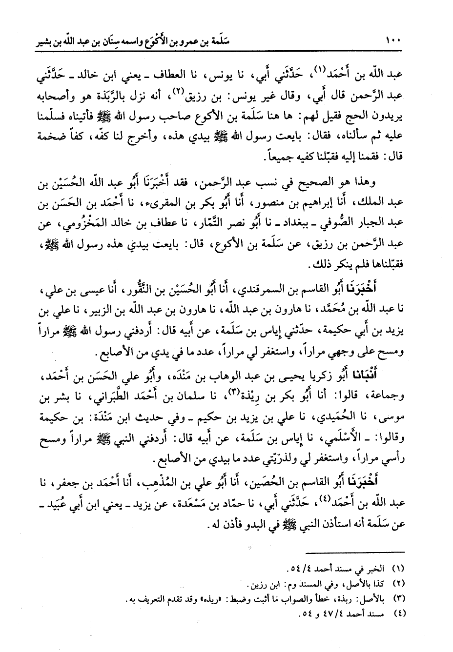 عبد الله بن أحمد (1) حدثني أبي نا يونس نا العطاف يعني ابن خالد حدثني عبد الرحمن قال أبي وقال غير يونس بن رزيق (2) أنه نزل بالربذة هو وأصحابه يريدون الحج فقيل لهم ها هنا سلمة بن الأكوع صاحب رسول الله (صلى الله عليه وسلم) فأتيناه فسلمنا عليه ثم سألناه فقال بايعت رسول الله (صلى الله عليه وسلم) بيدي هذه وأخرج لنا كفه كفا ضخمة قال فقمنا إليه فقبلنا كفيه جميعا وهذا هو الصحيح في نسب عبد الرحمن فقد أخبرنا أبو عبد الله الحسين بن عبد الملك أنا إبراهيم بن منصور أنا أبو بكر بن المقرئ نا أحمد بن الحسن بن عبد الجبار الصوفي ببغداد نا أبو نصر التمار نا عطاف بن خالد المخزومي عن عبد الرحمن بن رزيق عن سلمة بن الأكوع قال بايعت بيدي هذه رسول الله (صلى الله عليه وسلم) فقبلناها فلم ينكر ذلك أخبرنا أبو القاسم بن السمرقندي أنا أبو الحسين بن النقور أنا عيسى بن علي نا عبد الله بن محمد نا هارون بن عبد الله نا هارون بن عبد الله بن الزبير نا علي بن يزيد بن أبي حكيمة حدثني إياس بن سلمة عن أبيه قال أردفني رسول الله (صلى الله عليه وسلم) مرارا ومسح على وجهي مرارا واستغفر لي مرارا عدد ما في يدي من الأصابع أنبأنا أبو زكريا يحيى بن عبد الوهاب بن منده وأبو علي الحسن بن أحمد وجماعة قالوا أنا أبو بكر بن ريذة (3) نا سلمان بن أحمد الطبراني نا بشر بن موسى نا الحميدي نا علي بن يزيد بن حكيم وفي حديث ابن مندة بن حكيمة وقالوا الأسلمي نا إياس بن سلمة عن أبيه قال أردفني النبي (صلى الله عليه وسلم) مرارا ومسح رأسي مرارا واستغفر لي ولذريتي عدد ما بيدي من الأصابع أخبرنا أبو القاسم بن الحصين أنا أبو علي بن المذهب أنا أحمد بن جعفر نا عبد الله بن أحمد (4) حدثني أبي نا حماد بن مسعدة عن يزيد يعني ابن أبي عبيد عن سلمة أنه استأذن النبي (صلى الله عليه وسلم) في البدو فأذن له