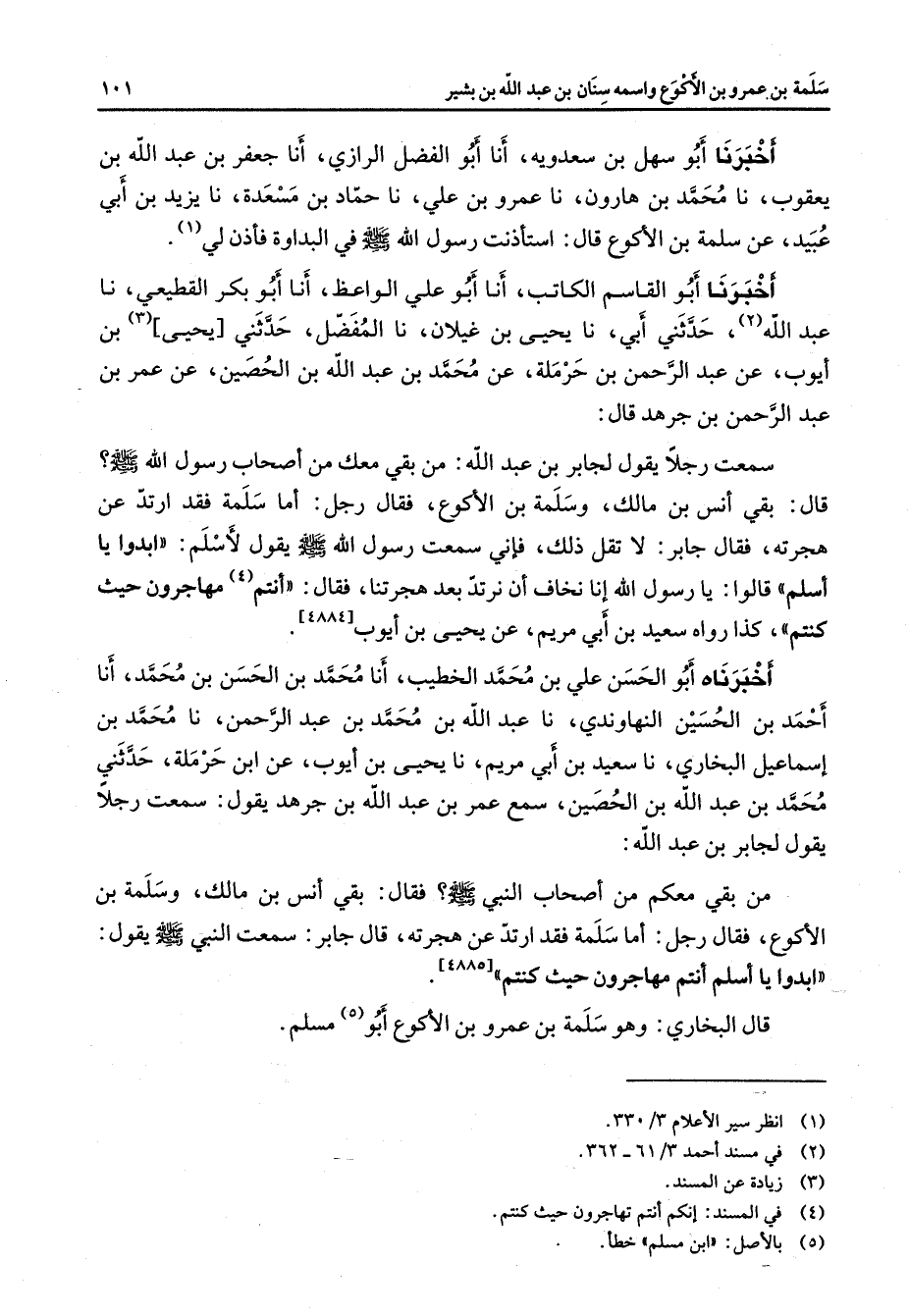 أخبرنا أبو القاسم الكاتب أنا أبو علي الواعظ أنا أبو بكر القطيعي نا عبد الله (2) حدثني أبي نا يحيى بن غيلان نا المفضل حدثني يحيى (3) بن أيوب عن عبد الرحمن بن حرملة عن محمد بن عبد الله بن الحصين عن عمر بن عبد الرحمن بن جرهد قال سمعت رجلا يقول لجابر بن عبد الله من بقي معك من أصحاب رسول الله (صلى الله عليه وسلم) قال بقي أنس بن مالك وسلمة بن الأكوع فقال رجل أما سلمة فقد ارتد عن هجرته فقال جابر لا تقل ذلك فإني سمعت رسول الله (صلى الله عليه وسلم) يقول لأسلم ابدوا يا أسلم قالوا يا رسول الله إنا نخاف أن نرتد بعد هجرتنا فقال أنتم (4) مهاجرون حيث كنتم كذا رواه سعيد بن أبي مريم عن يحيى بن أيوب أخبرناه أبو الحسن علي بن محمد الخطيب أنا محمد بن الحسن بن محمد أنا أحمد بن الحسين النهاوندي نا عبد الله بن محمد بن عبد الرحمن نا محمد بن إسماعيل البخاري نا سعيد بن أبي مريم نا يحيى بن أيوب عن ابن حرملة حدثني محمد بن عبد الله بن الحصين سمع عمر بن عبد الله بن جرهد يقول سمعت رجلا يقول لجابر بن عبد الله من بقي معكم من أصحاب النبي (صلى الله عليه وسلم) فقال بقي أنس بن مالك وسلمة بن الأكوع فقال رجل أما سلمة فقد ارتد عن هجرته قال جابر سمعت النبي (صلى الله عليه وسلم) يقول ابدوا يا أسلم أنتم مهاجرون حيث كنتم قال البخاري وهو سلمة بن عمرو بن الأكوع أبو (5) مسلم