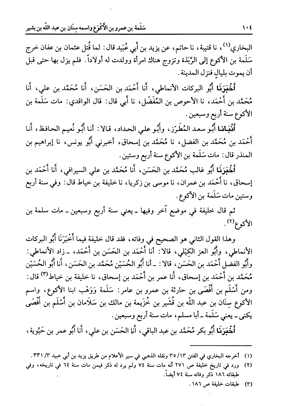 البخاري (1) نا قتيبة نا حاتم عن يزيد بن أبي عبيد قال لما قتل عثمان بن عفان خرج سلمة بن الأكوع إلى الربذة وتزوج هناك امرأة وولدت له أولادا فلم يزل بها حتى قبل أن يموت بليال فنزل المدينة أخبرنا أبو البركات الأنماطي أنا أحمد بن الحسن أنا محمد بن علي أنا محمد بن أحمد نا الأحوص بن المفضل نا أبي قال قال الواقدي مات سلمة بن الأكوع سنة أربع وسبعين أنبأنا أبو سعد المطرز وأبو علي الحداد قالا أنا أبو نعيم الحافظ أنا أحمد بن محمد بن الفضل نا محمد بن إسحاق أخبرني أبو يونس نا إبراهيم بن المنذر قال مات سلمة بن الأكوع سنة أربع وستين أخبرنا أبو غالب محمد بن الحسن أنا محمد بن علي السيرافي أنا أحمد بن إسحاق نا أحمد بن عمران نا موسى بن زكريا نا خليفة بن خياط قال وفي سنة أربع وستين مات سلمة بن الأكوع ثم قال خليفة في موضع آخر وفيها يعني سنة أربع وسبعين مات سلمة بن الأكوع (2)