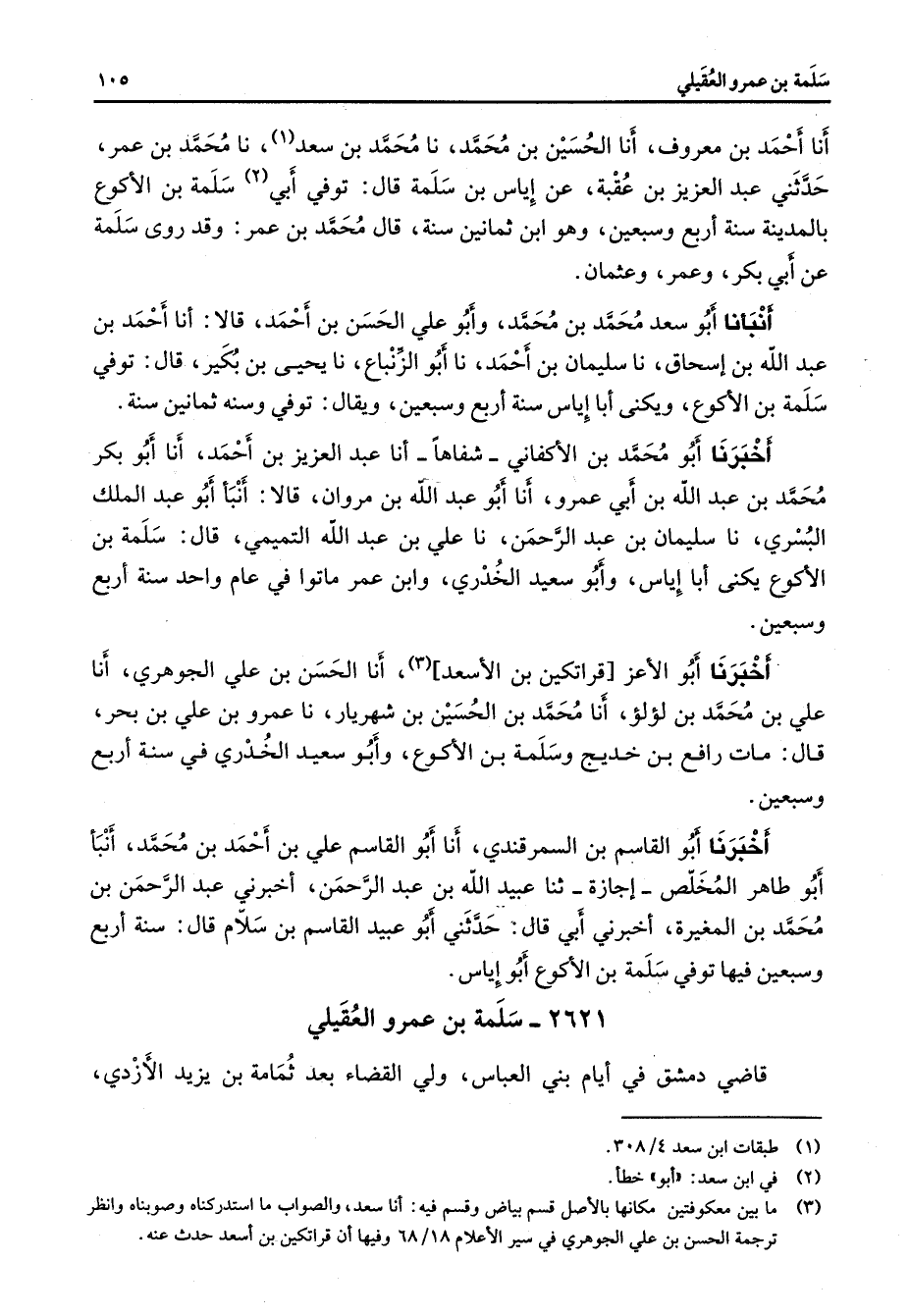 أنا أحمد بن معروف أنا الحسين بن محمد نا محمد بن سعد (1) نا محمد بن عمر حدثني عبد العزيز بن عقبة عن إياس بن سلمة قال توفي أبي (2) سلمة بن الأكوع بالمدينة سنة أربع وسبعين وهو ابن ثمانين سنة قال محمد بن عمر وقد روى سلمة عن أبي بكر وعمر وعثمان أنبأنا أبو سعد محمد بن محمد وأبو علي الحسن بن أحمد قالا أنا أحمد بن عبد الله بن إسحاق نا سليمان بن أحمد نا أبو الزنباع نا يحيى بن بكير قال توفي سلمة بن الأكوع ويكنى أبا إياس سنة أربع وسبعين ويقال توفي وسنه ثمانين سنة أخبرنا أبو محمد بن الأكفاني شفاها أنا عبد العزيز بن أحمد أنا أبو بكر محمد بن عبد الله بن أبي عمرو أنا أبو عبد الله بن مروان قالا أنبأ أبو عبد الملك البسري نا سليمان بن عبد الرحمن نا علي بن عبد الله التميمي قال سلمة بن الأكوع يكنى أبا إياس وأبو سعيد الخدري وابن عمر ماتوا في عام واحد سنة أربع وسبعين أخبرنا أبو الأعز قراتكين بن الأسعد (3) أنا الحسن بن علي الجوهري أنا علي بن محمد بن لؤلؤ أنا محمد بن الحسين بن شهريار نا عمرو بن علي بن بحر قال مات رافع بن خديج وسلمة بن الأكوع وأبو سعيد الخدري في سنة أربع وسبعين أخبرنا أبو القاسم بن السمرقندي أنا أبو القاسم علي بن أحمد بن محمد أنبأ أبو طاهر المخلص إجازة ثنا عبيد الله بن عبد الرحمن أخبرني عبد الرحمن بن محمد بن المغيرة أخبرني أبي قال حدثني أبو عبيد القاسم بن سلام قال سنة أربع وسبعين فيها توفي سلمة بن الأكوع أبو إياس 2621 سلمة بن عمرو العقيلي قاضي دمشق في أيام بني العباس ولي القضاء بعد ثمامة بن يزيد الأزدي