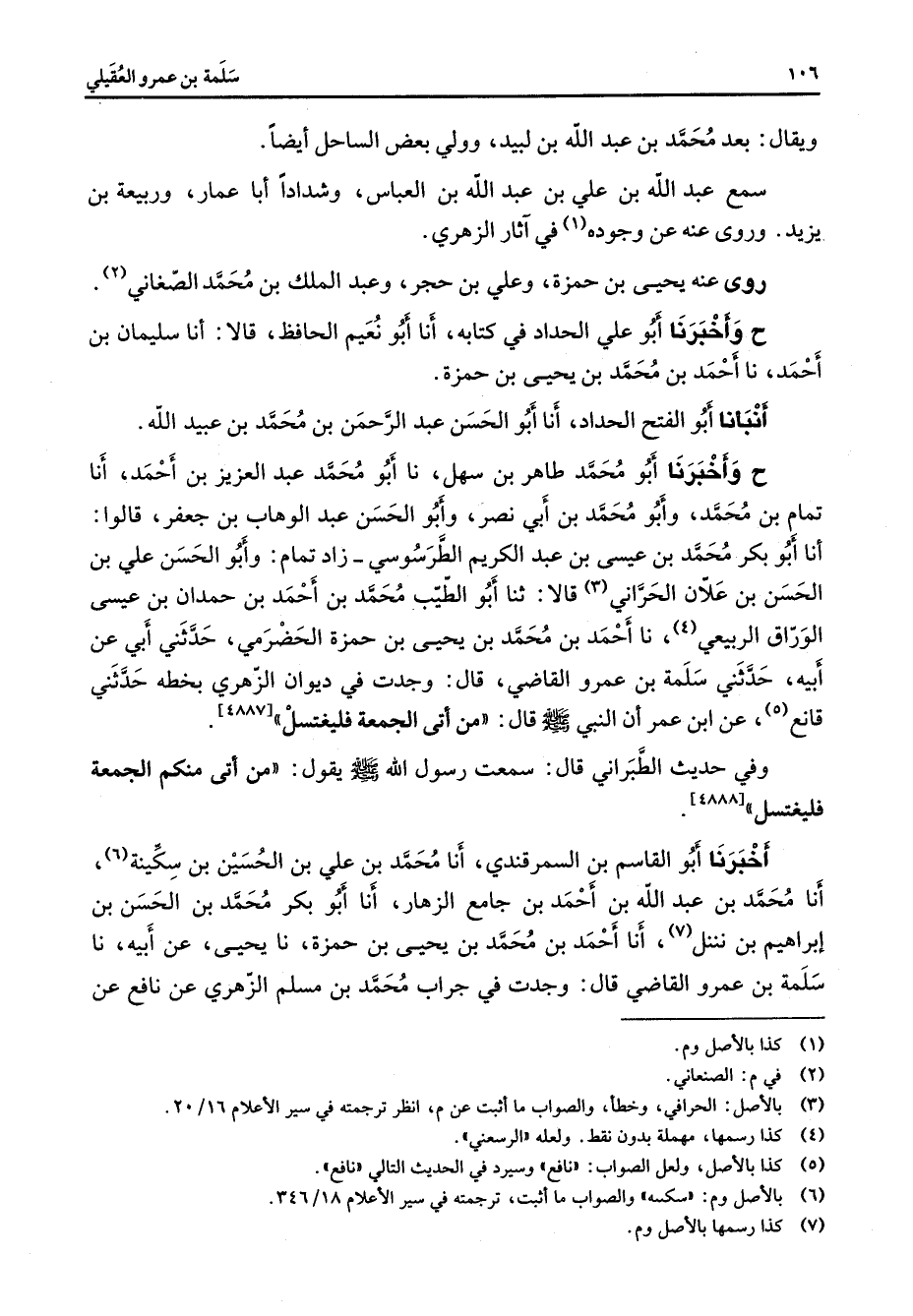 ح وأخبرنا أبو علي الحداد في كتابه أنا أبو نعيم الحافظ قالا أنا سليمان بن أحمد نا أحمد بن محمد بن يحيى بن حمزة أنبأنا أبو الفتح الحداد أنا أبو الحسن عبد الرحمن بن محمد بن عبيد الله ح وأخبرنا أبو محمد طاهر بن سهل نا أبو محمد عبد العزيز بن أحمد أنا تمام بن محمد وأبو محمد بن أبي نصر وأبو الحسن عبد الوهاب بن جعفر قالوا أنا أبو بكر محمد بن عيسى بن عبد الكريم الطرسوسي زاد تمام وأبو الحسن علي بن الحسن بن علان الحراني (3) قالا ثنا أبو الطيب محمد بن أحمد بن حمدان بن عيسى الوراق الربيعي (4) نا أحمد بن محمد بن بحبي بن حمزة الحضرمي حدثني أبي عن أبيه حدثني سلمة بن عمرو القاضي قال وجدت في ديوان الزهري بخطه حدثني قانع (5) عن ابن عمر أن النبي (صلى الله عليه وسلم) قال من أتى الجمعة فليغتسل وفي حديث الطبراني قال سمعت رسول الله (صلى الله عليه وسلم) يقول من أتى منكم الجمعة فليغتسل أخبرنا أبو القاسم بن السمرقندي أنا محمد بن علي بن الحسين بن سكينة (6) أنا محمد بن عبد الله بن أحمد بن جامع الزهار أنا أبو بكر محمد بن الحسن بن إبراهيم بن نننل (7) أنا أحمد بن محمد بن يحيى بن حمزة نا يحيى عن أبيه نا سلمة بن عمرو القاضي قال وجدت في جراب محمد بن مسلم الزهري عن نافع عن