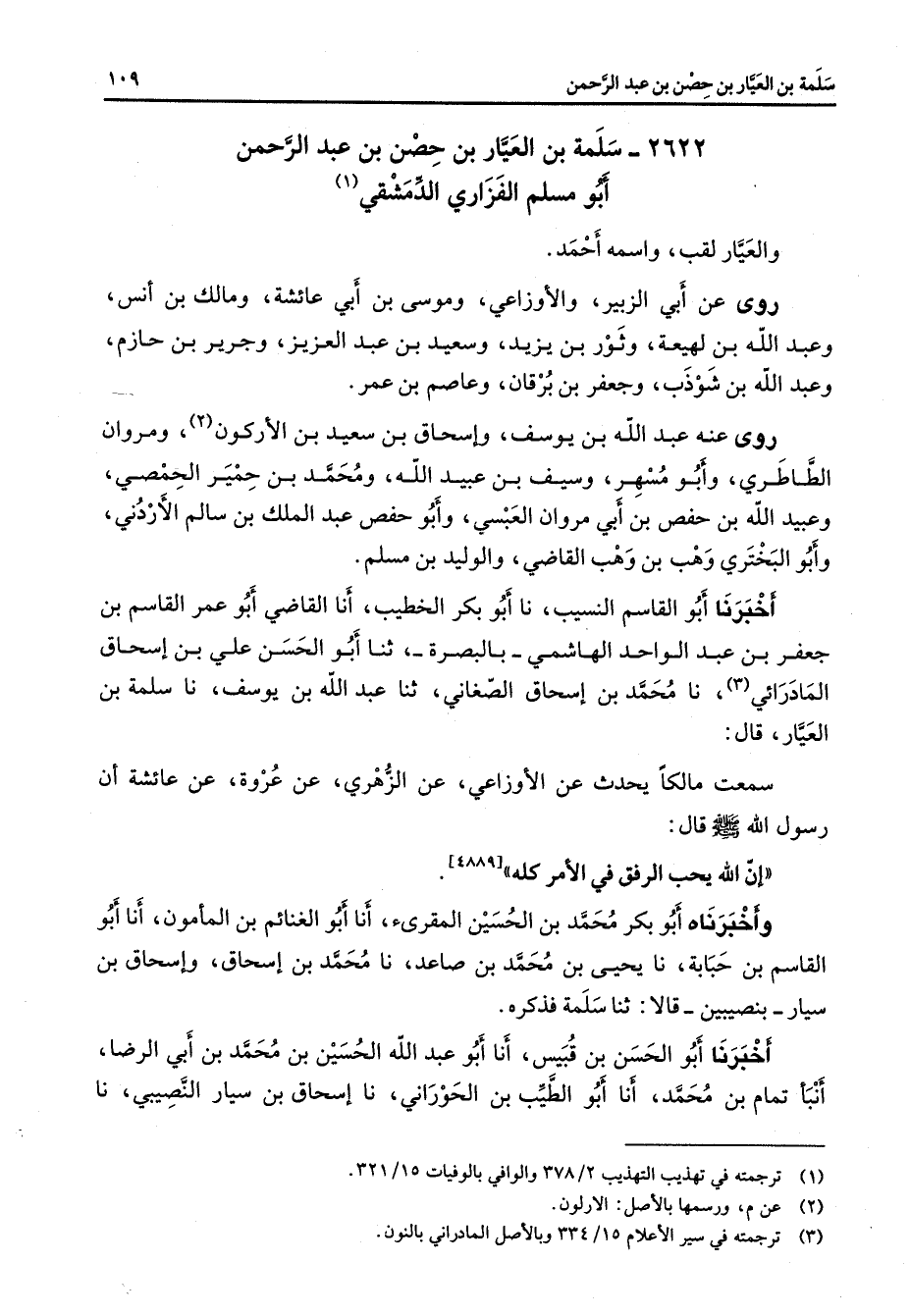 2622 - سلمة بن العيار بن حصن بن عبد الرحمن أبو مسلم الفزاري الدمشقي (1) والعيار لقب واسمه أحمد روى عن أبي الزبير والأوزاعي وموسى بن أبي عائشة ومالك بن أنس وعبد الله بن لهيعة وثور بن يزيد وسعيد بن عبد العزيز وجرير بن حازم وعبد الله بن شوذب وجعفر بن برقان وعاصم بن عمر روى عنه عبد الله بن يوسف وإسحاق بن سعيد بن الأركون (2) ومروان الطاطري وأبو مسهر وسيف بن عبيد الله ومحمد بن حمير الحمصي وعبيد الله بن حفص بن أبي مروان العبسي وأبو حفص عبد الملك بن سالم الأردني وأبو البختري وهب بن وهب القاضي والوليد بن مسلم أخبرنا أبو القاسم النسيب نا أبو بكر الخطيب أنا القاضي أبو عمر القاسم بن جعفر بن عبد الواحد الهاشمي بالبصرة ثنا أبو الحسن علي بن إسحاق المادرائي (3) نا محمد بن إسحاق الصغاني ثنا عبد الله بن يوسف نا سلمة بن العيار قال سمعت مالكا يحدث عن الأوزاعي عن الزهري عن عروة عن عائشة أن رسول الله (صلى الله عليه وسلم) قال إن الله يحب الرفق في الأمر كله وأخبرناه أبو بكر محمد بن الحسين المقرئ أنا أبو الغنائم بن المأمون أنا أبو القاسم بن حبابة نا يحيى بن محمد بن صاعد نا محمد بن إسحاق وإسحاق بن سيار بنصيبين قالا ثنا سلمة فذكره أخبرنا أبو الحسن بن قبيس أنا أبو عبد الله الحسين بن محمد بن أبي الرضا أنبأ تمام بن محمد أنا أبو الطيب بن الحوراني نا إسحاق بن سيار النصيبي نا