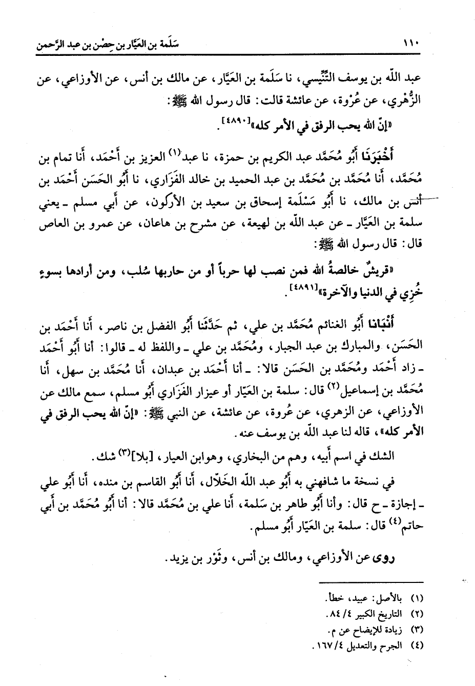 في نسخة ما شافهني به أبو عبد الله الخلال أنا أبو القاسم بن منده أنا أبو علي إجازة قال وأنا أبو طاهر بن سلمة أنا علي بن محمد قالا أنا أبو محمد بن أبي حاتم (4) قال سلمة بن العيار أبو مسلم روى عن الأوزاعي ومالك بن أنس وثور بن يزيد