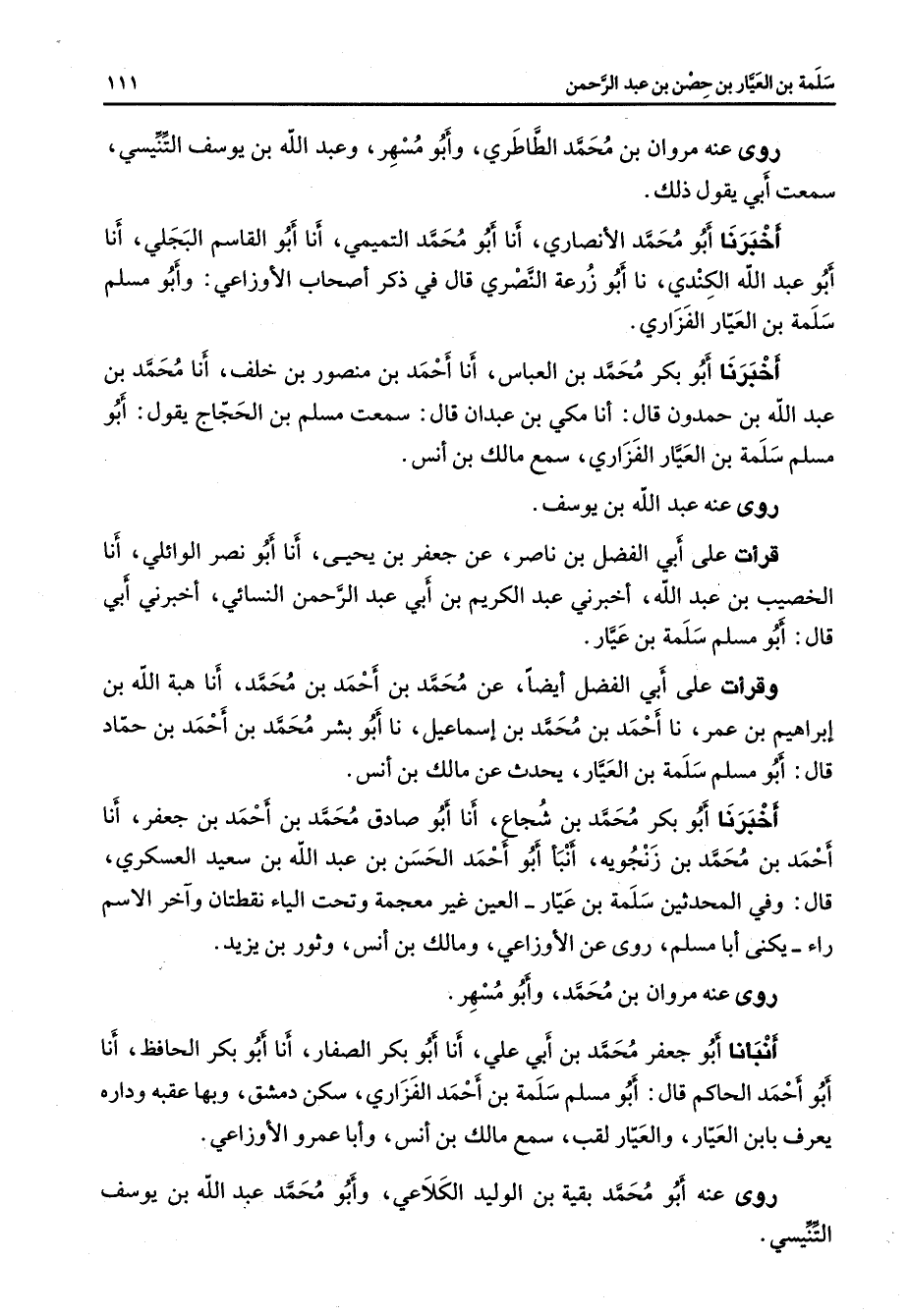 روى عنه مروان بن محمد الطاطري وأبو مسهر وعبد الله بن يوسف التنيسي سمعت أبي يقول ذلك أخبرنا أبو محمد الأنصاري أنا أبو محمد التميمي أنا أبو القاسم البجلي أنا أبو عبد الله الكندي نا أبو زرعة النصري قال في ذكر أصحاب الأوزاعي وأبو مسلم سلمة بن العيار الفزاري أخبرنا أبو بكر محمد بن العباس أنا أحمد بن منصور بن خلف أنا محمد بن عبد الله بن حمدون قال أنا مكي بن عبدان قال سمعت مسلم بن الحجاج يقول أبو مسلم سلمة بن العيار الفزاري سمع مالك بن أنس روى عنه عبد الله بن يوسف قرأت على أبي الفضل بن ناصر عن جعفر بن يحيى أنا أبو نصر الوائلي أنا الخصيب بن عبد الله أخبرني عبد الكريم بن أبي عبد الرحمن النسائي أخبرني أبي قال أبو مسلم سلمة بن عيار وقرأت على أبي الفضل أيضا عن محمد بن أحمد بن محمد أنا هبة الله بن إبراهيم بن عمر نا أحمد بن محمد بن إسماعيل نا أبو بشر محمد بن أحمد بن حماد قال أبو مسلم سلمة بن العيار يحدث عن مالك بن أنس أخبرنا أبو بكر محمد بن شجاع أنا أبو صادق محمد بن أحمد بن جعفر أنا أحمد بن محمد بن زنجويه أنبأ أبو أحمد الحسن بن عبد الله بن سعيد العسكري قال وفي المحدثين سلمة بن عيار العين غير معجمة وتحت الياء نقطتان وآخر الاسم راء يكنى أبا مسلم روى عن الأوزاعي ومالك بن أنس وثور بن يزيد روى عنه مروان بن محمد وأبو مسهر أنبأنا أبو جعفر محمد بن أبي علي أنا أبو بكر الصفار أنا أبو بكر الحافظ أنا أبو أحمد الحاكم قال أبو مسلم سلمة بن أحمد الفزاري سكن دمشق وبها عقبه وداره يعرف بابن العيار والعيار لقب سمع مالك بن أنس وأبا عمرو الأوزاعي روى عنه أبو محمد بقية بن الوليد الكلاعي وأبو محمد عبد الله بن يوسف التنيسي