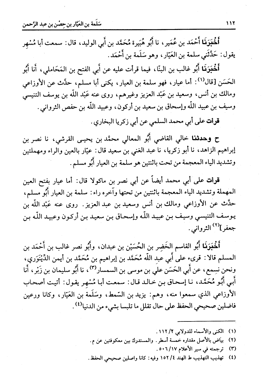 أخبرنا أحمد بن عمير نا أبو هبيرة محمد بن أبي الوليد قال سمعت أبا مسهر يقول حدثني سلمة بن العيار وهو سلمة بن أحمد أخبرنا أبو غالب بن البنا فيما قرأت عليه عن أبي الفتح بن المحاملي أنا أبو الحسن قال (1) : أما عيار فهو سلمة بن العيار يكنى أبا مسلم حدث عن الأوزاعي ومالك بن أنس وسعيد بن عبد العزيز وغيرهم روى عنه عبد الله بن يوسف التنيسي وسيف بن عبيد الله وإسحاق بن سعيد بن أركون وعبيد الله بن حفص الثرواني قرأت على أبي محمد السلمي عن أبي زكريا البخاري ح وحدثنا خالي القاضي أبو المعالي محمد بن يحيى القرشي نا نصر بن إبراهيم الزاهد نا أبو زكريا نا عبد الغني بن سعيد قال عيار بالعين والراء ومهملتين وتشديد الياء المعجمة من تحت باثنتين هو سلمة بن العيار أبو مسلم قرأت على أبي محمد أيضا عن أبي نصر بن ماكولا قال أما عيار بفتح العين المهملة وتشديد الياء المعجمة باثنتين من تحتها وآخره راء سلمة بن العيار أبو مسلم حدث عن الأوزاعي ومالك بن أنس وسعيد بن عبد العزيز روى عنه عبد الله بن يوسف التنيسي وسيف بن عبيد الله وإسحاق بن سعيد بن أركون وعبيد الله بن جعفر (2) الثرواني