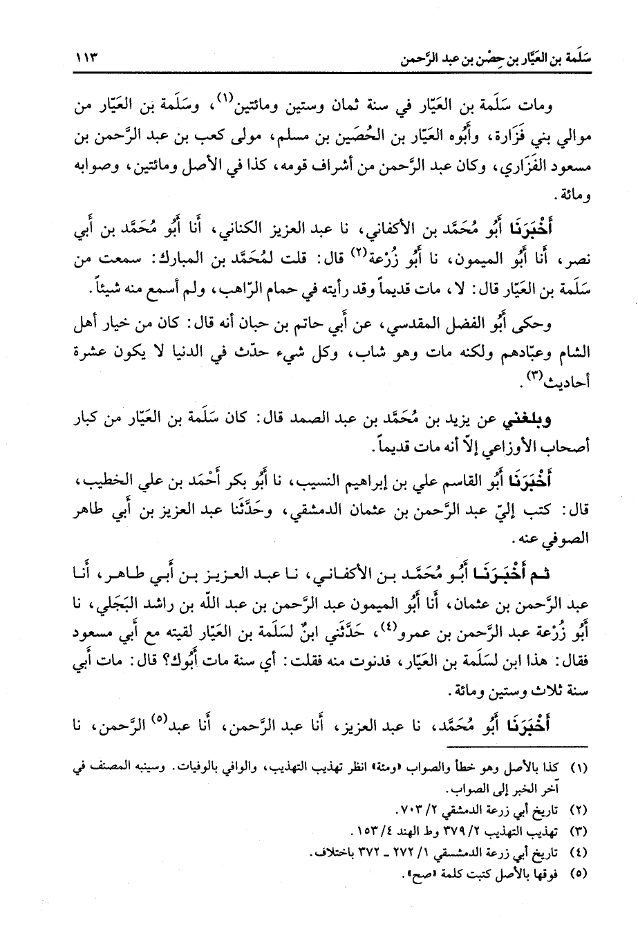 وبلغني عن يزيد بن محمد بن عبد الصمد قال كان سلمة بن العيار من كبار أصحاب الأوزاعي إلا أنه مات قديما أخبرنا أبو القاسم علي بن إبراهيم النسيب نا أبو بكر أحمد بن علي الخطيب قال كتب إلي عبد الرحمن بن عثمان الدمشقي وحدثنا عبد العزيز بن أبي طاهر الصوفي عنه ثم أخبرنا أبو محمد بن الأكفاني نا عبد العزيز بن أبي طاهر أنا عبد الرحمن بن عثمان أنا أبو الميمون عبد الرحمن بن عبد الله بن راشد البجلي نا أبو زرعة عبد الرحمن بن عمرو (4) حدثني ابن لسلمة بن العيار لقيته مع أبي مسعود فقال هذا ابن لسلمة بن العيار فدنوت منه فقلت أي سنة مات أبوك قال مات أبي سنة ثلاث وستين ومائة أخبرنا أبو محمد نا عبد العزيز أنا عبد الرحمن أنا عبد (5) الرحمن نا