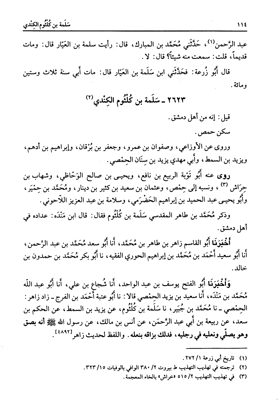 2623 - سلمة بن كلثوم الكندي (2) قيل إنه من أهل دمشق سكن حمص وروى عن الأوزاعي وصفوان بن عمرو وجعفر بن برقان وإبراهيم بن أدهم ويزيد بن السمط وأبي مهدي يزيد بن سنان الحمصي روى عنه أبو توبة الربيع بن نافع ويحيى بن صالح الوحاظي وشهاب بن حراش (3) ونسبه إلى حمص وعثمان بن سعيد بن كثير بن دينار ومحمد بن حمير وأبو يحيى عبد الحميد بن إبراهيم الحضرمي وسلامة بن عبد العزيز اللاحوني وذكر محمد بن طاهر المقدسي سلمة بن كلثوم فقال قال ابن منده عداده في أهل دشق أخبرنا أبو القاسم زاهر بن طاهر بن محمد أنا أبو سعد محمد بن عبد الرحمن أنا أبو سعيد أحمد بن محمد بن إبراهيم الحوري الفقيه نا أبو بكر محمد بن حمدون بن خالد وأخبرنا أبو الفتح يوسف بن عبد الواحد أنا شجاع بن علي أنا أبو عبد الله محمد بن منده أنا سعيد بن يزيد الحمصي قالا نا أبو عتبة أحمد بن الفرج زاد زاهر الحمصي نا محمد بن جبير نا سلمة بن كلثوم عن يزيد بن السمط عن الحكم بن سعد عن ربيعة بن أبي عبد الرحمن عن أنس بن مالك عن رسول الله (صلى الله عليه وسلم) أنه بصق وهو يصلي ونعليه في رجليه فدلك بزاقه بنعله واللفظ لحديث زاهر
