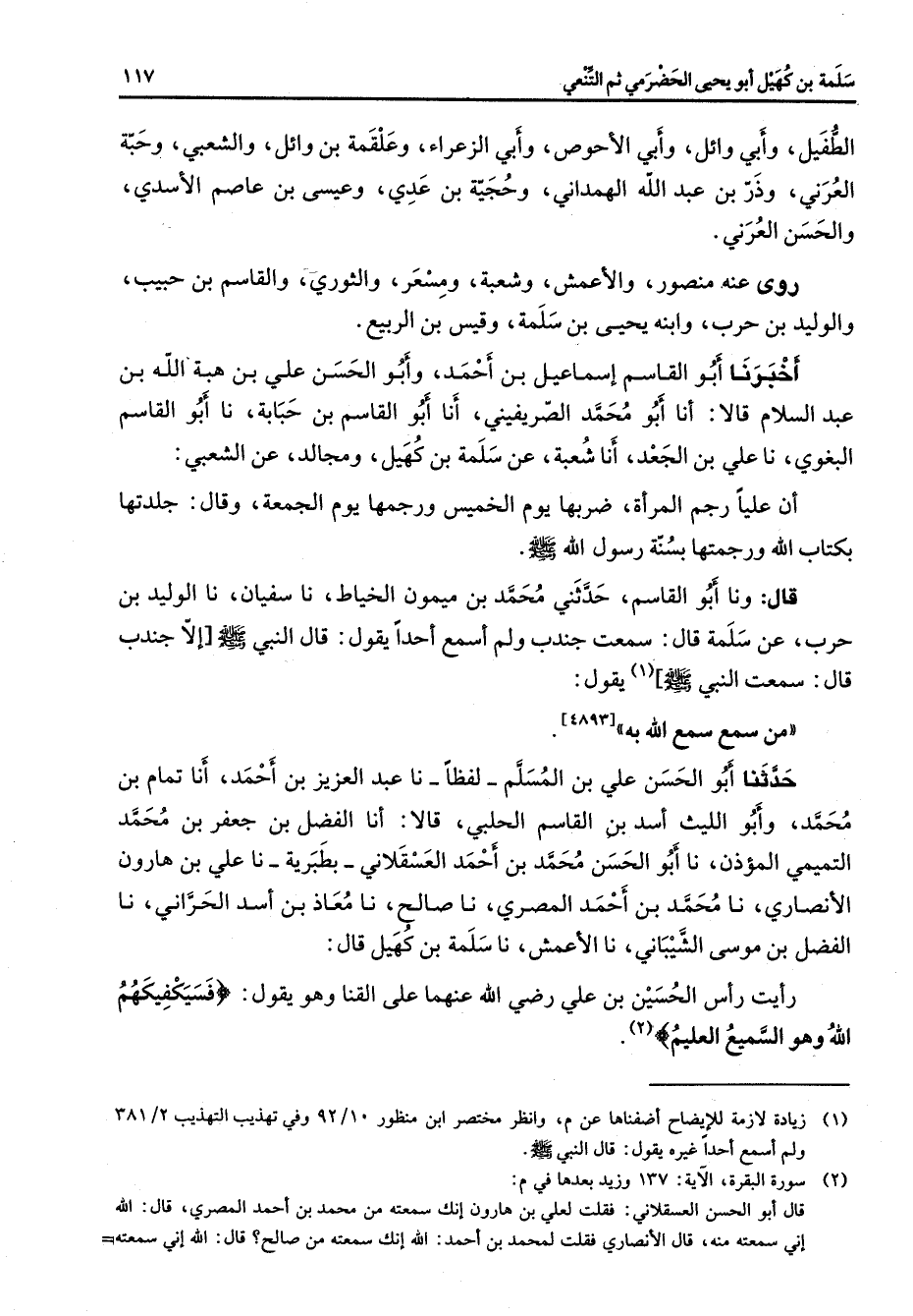 الطفيل وأبي وائل الأحوص وأبي الزعراء وعلقمة بن وائل والشعبي وحبة العرني وذر بن عبد الله الهمداني وحجية بن عدي وعيسى بن عاصم الأسدي والحسن العرني روى عنه منصور والأعمش وشعبة ومسعر والثوري والقاسم بن حبيب والوليد بن حرب وابنه يحيى بن سلمة وقيس بن الربيع أخبرنا أبو القاسم إسماعيل بن أحمد وأبو الحسن علي بن هبة الله بن عبد السلام قالا أنا أبو محمد الصريفيني أنا أبو القاسم بن حبابة نا أبو القاسم البغوي نا علي بن الجعد أنا شعبة عن سلمة بن كهيل ومجالد عن الشعبي أن عليا رجم المرأة ضربها يوم الخميس ورجمها يوم الجمعة وقال جلدتها بكتاب الله ورجمتها بسنة رسول الله (صلى الله عليه وسلم) قال ونا أبو القاسم حدثني محمد بن ميمون الخياط نا سفيان نا الوليد بن حرب عن سلمة قال سمعت جندب ولم أسمع أحدا يقول قال النبي (صلى الله عليه وسلم) إلا جندب قال سمعت النبي (صلى الله عليه وسلم) (1) يقول: من سمع سمع الله به حدثنا أبو الحسن علي بن المسلم لفظا نا عبد العزيز بن أحمد أنا تمام بن محمد وأبو الليث أسد بن القاسم الحلبي قالا أنا الفضل بن جعفر بن محمد التميمي المؤذن نا أبو الحسن محمد بن أحمد العسقلاني بطبرية نا علي بن هارون الأنصاري نا محمد بن أحمد المصري نا صالح نا معاذ بن أسد الحراني نا الفضل بن موسى الشيباني نا الأعمش نا سلمة بن كهيل قال رأيت رأس الحسين بن علي Bهما على القنا وهو يقول " فسيكفيكهم الله وهو السميع العليم " (2)