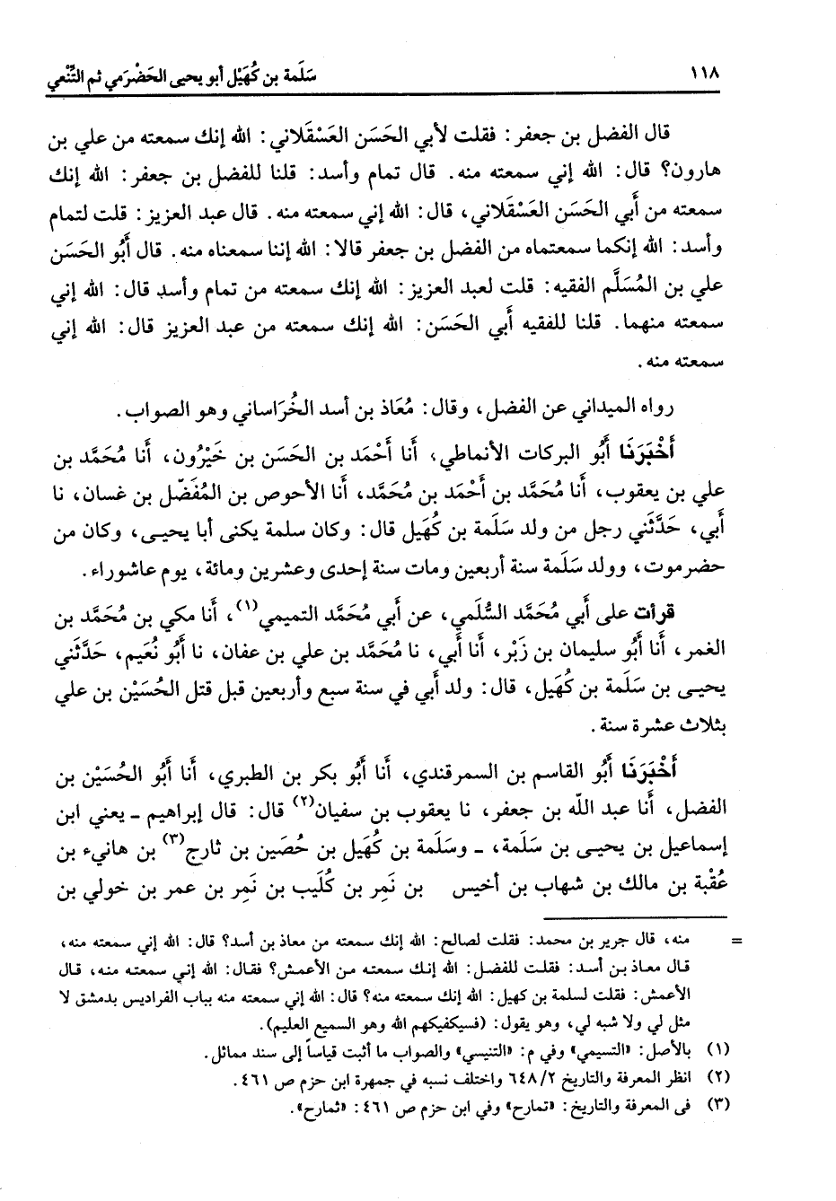 قال الفضل بن جعفر فقلت لأبي الحسن العسقلاني الله إنك سمعته من علي بن هارون قال الله إني سمعته منه قال تمام وأسد قلنا للفضل بن جعفر الله إنك سمعته من أبي الحسن العسقلاني قال الله إني سمعته منه قال عبد العزيز قلت لتمام وأسد الله إنكما سمعتماه من الفضل بن جعفر قالا الله إننا سمعناه منه قال أبو الحسن علي بن المسلم الفقيه قلت لعبد العزيز الله إنك سمعته من تمام وأسد قال الله إني سمعته منهما قلنا للفقيه أبي الحسن الله إنك سمعته من عبد العزيز قال الله إني سمعته منه رواه الميداني عن الفضل وقال معاذ بن أسد الخراساني وهو الصواب أخبرنا أبو البركات الأنماطي أنا أحمد بن الحسن بن خيرون أنا محمد بن علي بن يعقوب أنا محمد بن أحمد بن محمد أنا الأحوص بن المفضل بن غسان نا أبي حدثني رجل من ولد سلمة بن كهيل قال وكان سلمة يكنى أبا يحيى وكان من حضرموت وولد سلمة سنة أربعين ومات سنة إحدى وعشرين ومائة يوم عاشوراء قرأت على أبي محمد السلمي عن أبي محمد التميمي (1) أنا مكي بن محمد بن الغمر أنا أبو سليمان بن زبر أنا أبي نا محمد بن علي بن عفان نا أبو نعيم حدثني يحيى بن سلمة بن كهيل قال ولد أبي في سنة سبع وأربعين قبل قتل الحسين بن علي بثلاث عشرة سنة أخبرنا أبو القاسم بن السمرقندي أنا أبو بكر بن الطبري أنا أبو الحسين بن الفضل أنا عبد الله بن جعفر نا يعقوب بن سفيان (2) قال قال إبراهيم يعني ابن إسماعيل بن يحيى بن سلمة وسلمة بن كهيل بن حصين بن ثارج (3) بن هانئ بن عقبة بن مالك بن شهاب بن أخيس بن نمر بن كليب بن نمر بن عمر بن خولي بن