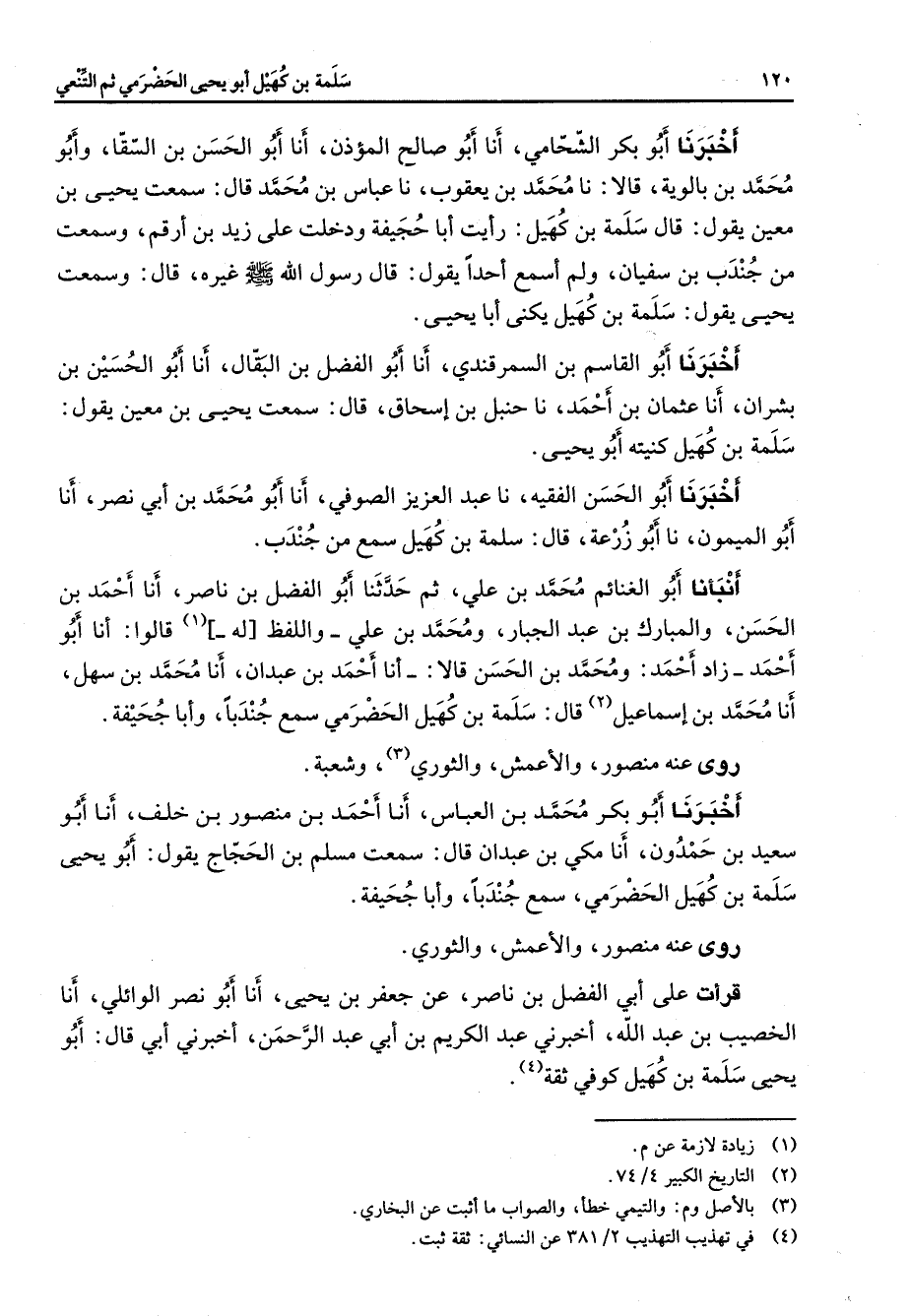 أخبرنا أبو بكر الشحامي أنا أبو صالح المؤذن أنا أبو الحسن بن السقا وأبو محمد بن بالوية قالا نا محمد بن يعقوب نا عباس بن محمد قال سمعت يحيى بن معين يقول قال سلمة بن كهيل رأيت أبا حجيفة ودخلت على زيد بن أرقم وسمعت من جندب بن سفيان ولم أسمع أحدا يقول قال رسول الله (صلى الله عليه وسلم) غيره قال وسمعت يحيى يقول سلمة بن كهيل يكنى أبا يحيى أخبرنا أبو القاسم بن السمرقندي أنا أبو الفضل بن البقال أنا أبو الحسين بن بشران أنا عثمان بن أحمد نا حنبل بن إسحاق قال سمعت يحيى بن معين يقول سلمة بن كهيل كنيته أبو يحيى أخبرنا أبو الحسن الفقيه نا عبد العزيز الصوفي أنا أبو محمد بن أبي نصر أنا أبو الميمون نا أبو زرعة قال سلمة بن كهيل سمع من جندب أنبأنا أبو الغنائم محمد بن علي ثم حدثنا أبو الفضل بن ناصر أنا أحمد بن الحسن والمبارك بن عبد الجبار ومحمد بن علي واللفظ له (1) قالوا أنا أبو أحمد زاد أحمد ومحمد بن الحسن قالا أنا أحمد بن عبدان أنا محمد بن سهل أنا محمد بن إسماعيل (2) قال سلمة بن كهيل الحضرمي سمع جندبا وأبا جحيفة روى عنه منصور والأعمش والثوري (3) وشعبة أخبرنا أبو بكر محمد بن العباس أنا أحمد بن منصور بن خلف أنا أبو سعيد بن حمدون أنا مكي بن عبدان قال سمعت مسلم بن الحجاج يقول أبو يحيى سلمة بن كهيل الحضرمي سمع جندبا وأبا جحيفة روى عنه منصور والأعمش والثوري قرأت على أبي الفضل بن ناصر عن جعفر بن يحيى أنا أبو نصر الوائلي أنا الخصيب بن عبد الله أخبرني عبد الكريم بن أبي عبد الرحمن أخبرني أبي قال أبو يحيى سلمة بن كهيل كوفي ثقة (4)