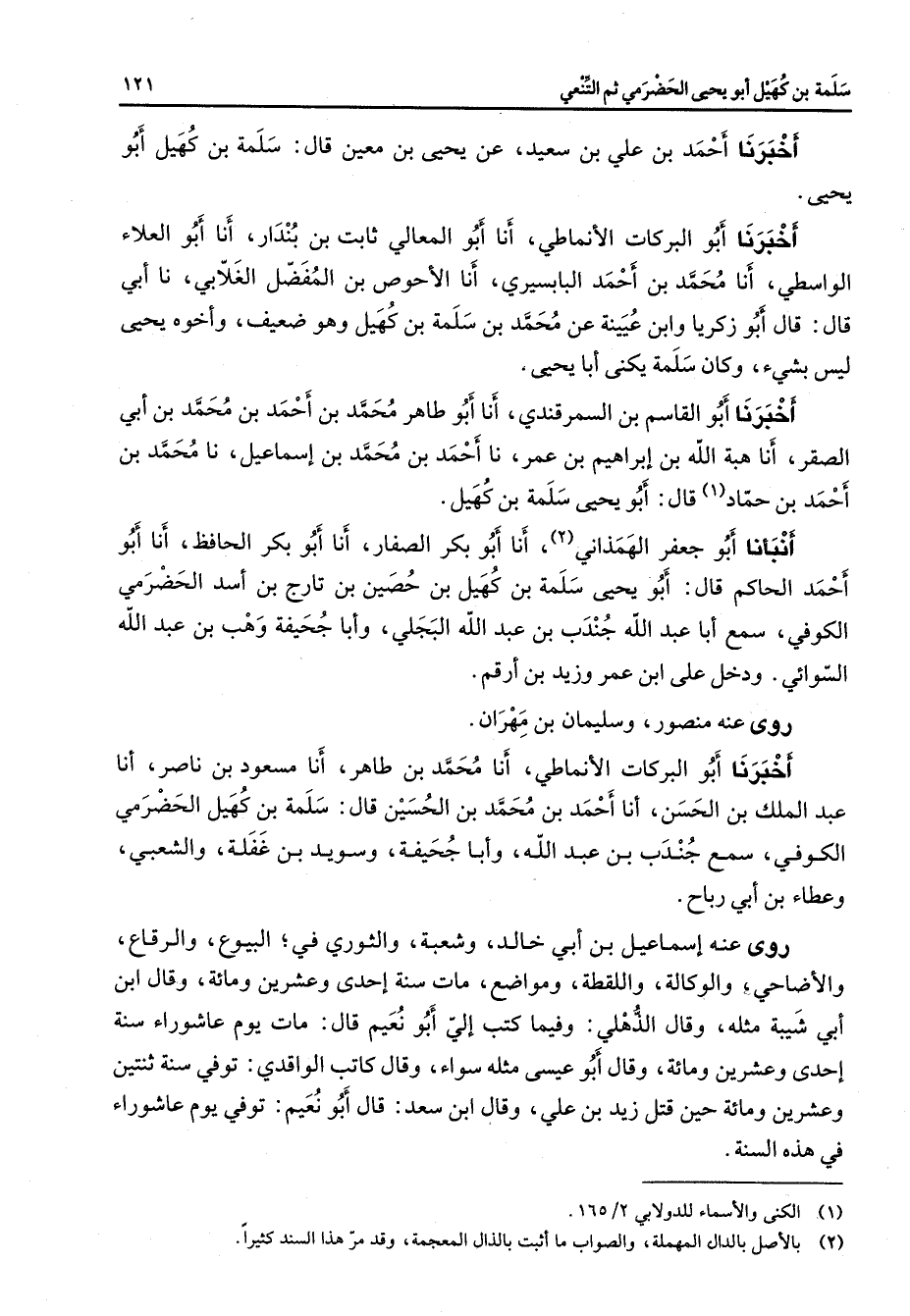 أخبرنا أحمد بن علي بن سعيد عن يحيى بن معين قال سلمة بن كهيل أبو يحيى أخبرنا أبو البركات الأنماطي أنا أبو المعالي أنا أبو المعالي ثابت بن نبدار أنا أبو العلاء الواسطي أنا محمد بن أحمد البابسيري أنا الأحوص بن المفضل الغلابي نا أبي قال قال أبو زكريا وابن عيينة عن محمد بن سلمة بن كهيل وهو ضعيف وأخوه يحيى ليس بشئ وكان سلمة يكنى أبا يحيى أخبرنا أبو القاسم بن السمرقندي أنا أبو طاهر محمد بن أحمد بن محمد بن أبي الصقر أنا هبة الله بن إبراهيم بن عمر نا أحمد بن محمد بن إسماعيل نا محمد بن أحمد بن حماد (1) قال: أبو يحيى سلمة بن كهيل أنبأنا أبو جعفر الهمذاني (2) أنا أبو بكر الصفار أنا أبو بكر الحافظ أنا أبو أحمد الحاكم قال أبو يحيى سلمة بن كهيل بن حصين بن تارج بن أسد الحضرمي الكوفي سمع أبا عبد الله جندب بن عبد الله البجلي وأبا جحيفة وهب بن عبد الله السوائي ودخل على ابن عمر وزيد بن أرقم روى عنه منصور وسليمان بن مهران أخبرنا أبو البركات الأنماطي أنا محمد بن طاهر أنا مسعود بن ناصر أنا عبد الملك بن الحسن أنا أحمد بن محمد بن الحسين قال سلمة بن كهيل الحضرمي الكوفي سمع جندب بن عبد الله وأبا جحيفة وسويد بن غفلة والشعبي وعطاء بن أبي رباح روى عنه إسماعيل بن أبي خالد وشعبة والثوري في البيوع والرقاع والأضاحي والوكالة واللقطة ومواضع ومات سنة إحدى وعشرين ومائة وقال ابن أبي شيبة مثله وقال الذهلي وفيما كتب إلي أبو نعيم قال مات يوم عاشوراء سنة إحدى وعشرين ومائة وقال أبو عيسى مثله سواء وقال كاتب الواقدي توفي سنة ثنتين وعشرين ومائة حين قتل زيد بن علي وقال ابن سعد قال أبو نعيم توفي يوم عاشوراء في هذه السنة
