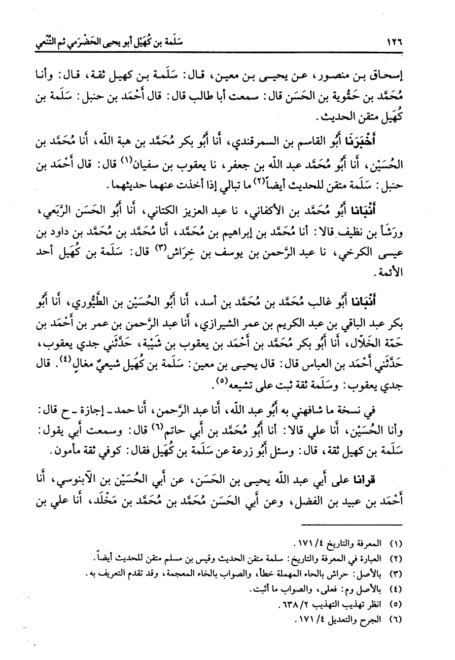 في نسخة ما شافهني به أبو عبد الله أنا عبد الرحمن انا حمد إجازة قال وأنا الحسين أنا علي قالا أنا أبو محمد بن أبي حاتم (6) قال وسمعت أبي يقول سلمة بن كهيل ثقة قال وسئل أبو زرعة عن سلمة بن كهيل فقال كوفي ثقة مأمون قرأنا على أبي عبد الله يحيى بن الحسن عن أبي الحسين بن الآبنوسي أنا أحمد بن عبيد بن الفضل وعن أبي الحسن محمد بن محمد بن مخلد أنا علي بن