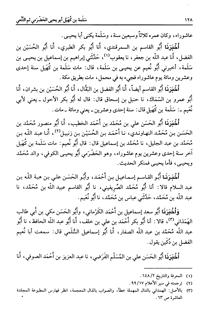 عاشوراء وكان عمره ثلاثا وسبعين سنة وسلمة يكنى أبا يحيى أخبرنا أبو القاسم بن السمرقندي أنا أبو بكر الطبري أنا أبو الحسين بن الفضل أنا عبد الله بن جعفر نا يعقوب (1) حدثني إبراهيم بن إسماعيل بن يحيى بن سلمة أخبرني أبو نعيم عن يحيى بن سلمة قال مات سلمة بن كهيل سنة إحدى وعشرين ومائة يوم عاشوراء فجئ به في محمل مات بطريق مكة أخبرنا أبو القاسم أيضا أنا أبو الفضل بن البقال أنا أبو الحسين بن بشران أنا أبو عمرو بن السماك نا حنبل بن إسحاق قال قال له أبو بكر الأحول يعني لأبي نعيم سلمة بن كهيل قال سنة إحدى وعشرين يعني ومائة مات أخبرنا أبو الحسن علي بن محمد بن أحمد الخطيب أنا أبو منصور محمد بن الحسن بن محمد النهاوندي نا أحمد بن الحسين بن زنبيل (2) أنا عبد الله بن محمد بن عبد الجليل نا محمد بن إسماعيل قال قال أبو نعيم مات سلمة بن كهيل آخر سنة إحدى وعشرين يوم عاشوراء وهو الحضرمي أبو يحيى الكوفي والد محمد ويحيى فأما يحيى فمنكر الحديث أخبرنا أبو القاسم إسماعيل بن أحمد وأبو الحسن علي بن هبة الله بن عبد السلام قالا أنا أبو محمد الصريفيني نا أبو القاسم عبيد الله بن محمد نا عبد الله بن محمد حدثني عباس بن محمد نا أبو نعيم وأخبرنا أبو سعد إسماعيل بن أحمد الكرماني وأبو الحسن مكي بن أبي طالب الهمذاني (3) قالا أنا أبو بكر احمد بن علي بن خلف أنا أبو عبد الله الحافظ نا أبو عبد الله محمد بن عبد الله الصفار أنا أبو إسماعيل السلمي قال سمعت أبا نعيم الفضل بن دكين يقول أخبرنا أبو الحسن علي بن المسلم الفرضي نا عبد العزيز بن أحمد الصوفي أنا