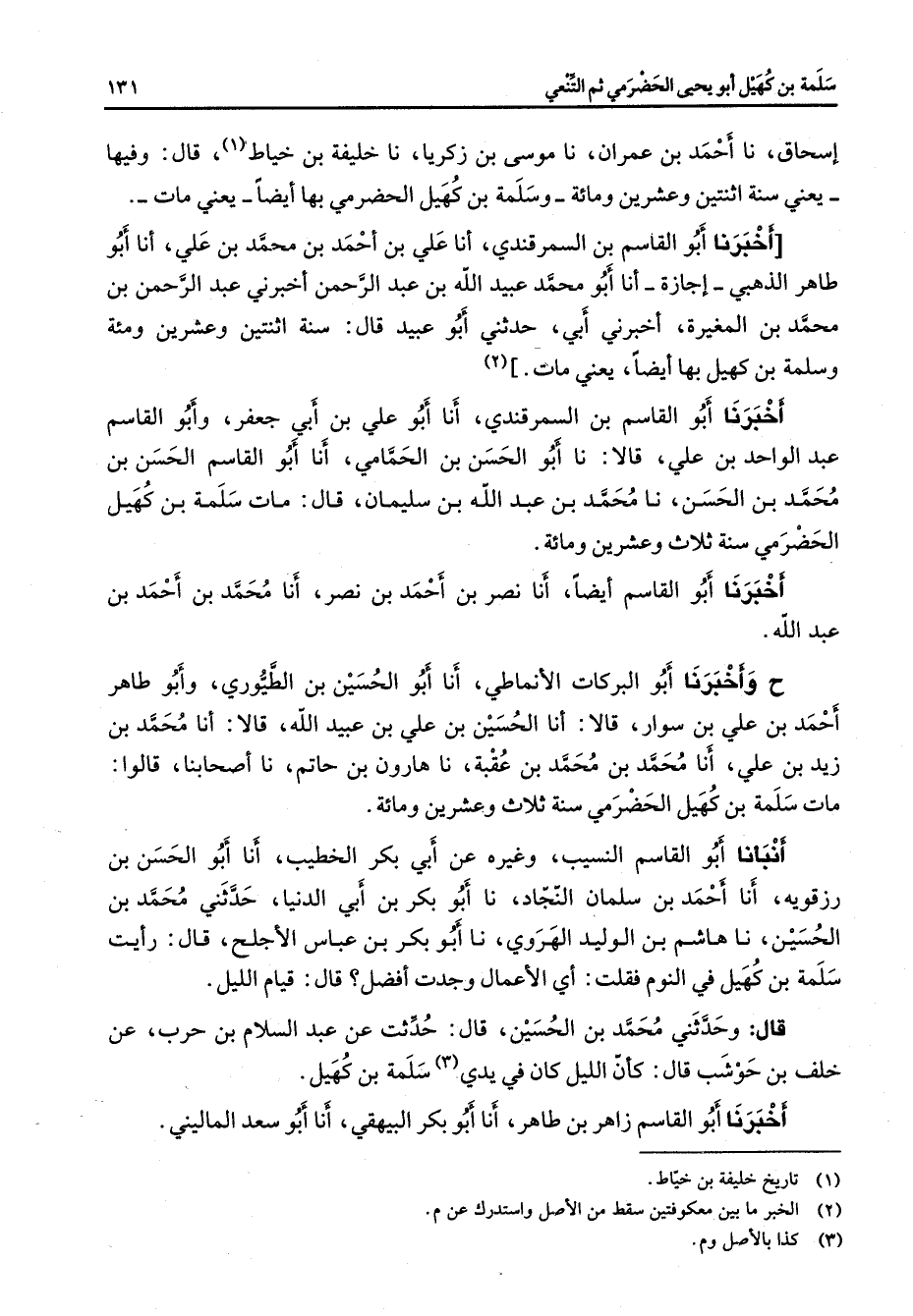 إسحاق نا أحمد بن عمران نا موسى بن زكريا نا خليفة بن خياط (1) قال وفيها يعني سنة اثنتين وعشرين ومائة وسلمة بن كهيل الحضرمي بها أيضا يعني مات أخبرنا أبو القاسم بن السمرقندي أنا علي بن أحمد بن محمد بن علي أنا أبو طاهر الذهبي إجازة أنا أبو محمد عبيد الله بن عبد الرحمن أخبرني عبد الرحمن بن محمد بن المغيرة أخبرني أبي حدثني أبو عبيد قال سنة اثنتين وعشرين ومئة وسلمة بن كهيل بها أيضا يعني مات (2)