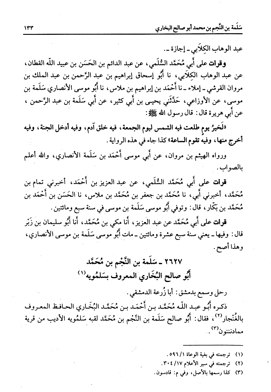 2627 - سلمة بن النجم بن محمد أبو صالح البخاري المعروف بسلمويه (1) رحل وسمع بدمشق أبا زرعة الدمشقي ذكره أبو عبد الله محمد بن أحمد بن محمد البخاري الحافظ المعروف بالغنجار (2) فقال أبو صالح سلمة بن النجم بن محمد لقبه سلمويه الأديب من قرية مما دنننون (3)