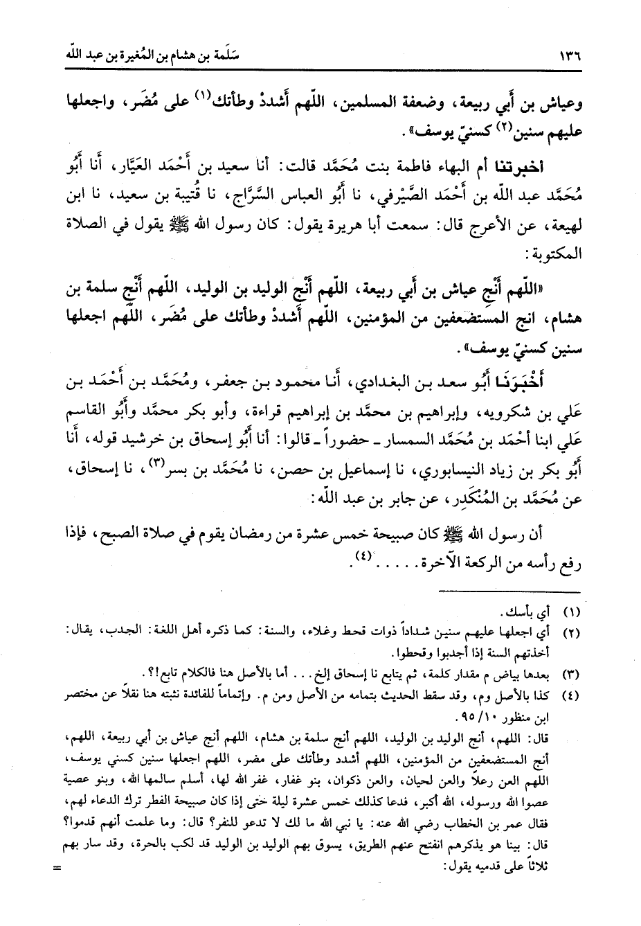 وعياش بن أبي ربيعة وضعفه المسلمين اللهم أشدد وطأتك (1) على مضر واجعلها عليهم سنين (2) كسني يوسف أخبرتنا أم البهاء فاطمة بنت محمد قالت أنا سعيد بن أحمد العيار أنا أبو محمد عبد الله بن أحمد الصيرفي نا أبو العباس السراج نا قتيبة بن سعيد نا ابن لهيعة عن الأعرج قال سمعت أبا هريرة يقول كان رسول الله (صلى الله عليه وسلم) يقول في الصلاة المكتوبة اللهم أنج عياش بن أبي ربيعة اللهم أنج الوليد بن الوليد اللهم انج وسلمة بن هشام وأنج المستضعفين من المؤمنين للهم أشدد وطأتك على مضر اللهم اجعلها سنيل كسني يوسف أخبرنا أبو سعد بن البغدادي أنا محمود بن جعفر ومحمد بن أحمد بن علي بن شكرويه وإبراهيم بن محمد بن إبراهيم قراءة وأبو بكر محمد وأبو القاسم علي ابنا أحمد بن محمد السمسار حضورا قالوا أنا أبو إسحاق بن خرشيد قوله أنا أبو بكر بن زياد النيسابوري نا إسماعيل بن حصن نا محمد بن بسر (3) نا إسحاق عن محمد بن المنكدر عن جابر بن عبد الله أن رسول الله (صلى الله عليه وسلم) كان صبيحة خمس عشرة من رمضان يقوم في صلاة الصبح فإذا رفع رأسه من الركعة الآخرة (4)