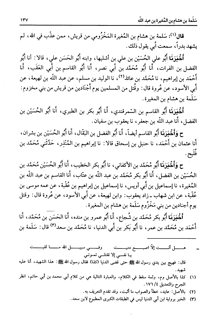 قال (1) : سلمة بن هشام بن المغيرة المخزومي من قريش ممن عذب في الله لم يشهد بدرا سمعت أبي يقول ذلك أخبرنا أبو علي الحسين بن علي بن أشليها وابنه أبو الحسن علي قالا أنا أبو الفضل بن الفرات أنا أبو محمد بن أبي نصر أنا أبو القاسم بن أبي العقب أنا أحمد بن إبراهيم نا محمد بن عائذ (2) نا الوليد بن مسلم عن عبد الله بن لهيعة عن أبي الأسود عن عروة قال وقتل من المسلمين يوم أجنادين من قريش من بني مخزوم سلمة بن هشام بن الغيرة أخبرنا أبو القاسم بن السمرقندي أنا أبو بكر بن الطبري أنا أبو الحسين بن الفضل أنا عبد الله بن جعفر نا يعقوب بن سفيان ح وأخبرنا أبو القاسم أيضا أنا أبو الفضل بن البقال أنا أبو الحسين بن بشران أناعثمان بن أحمد نا حنبل بن إسحاق قالا نا إبراهيم بن المنذر حدثني محمد بن فليح ح وأخبرنا أبو محمد بن الأكفاني نا أبو بكر الخطيب أنا أبو الحسين محمد بن الحسين بن الفضل أنا أبو بكر محمد بن عبد الله بن عتاب أنا القاسم بن عبد الله بن المغيرة نا إسماعيل بن أبي أويس نا إسماعيل بن إبراهيم بن عقبة عن عمه موسى بن عقبة عن ابن شهاب زاد يعقوب وابن لهيعة عن أبي الأسود عن عروة قال وقتل يوم أجنادين من بني مخزوم سلمة بن هشام بن المغيرة أخبرنا أبو بكر محمد بن شجاع أنا أبو عمرو بن منده أنا الحسن بن محمد أنا أحمد بن محمد بن عمر نا أبو بكر بن أبي الدنيا نا محمد بن سعد (3) قال سلمة بن