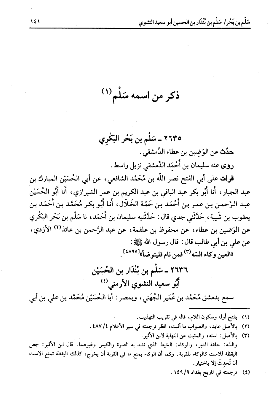 2635 - سلم بن بحر البكري حدث عن الوضين بن عطاء الدمشقي روى عنه سليمان بن أحمد الدمشقي نزيل واسط قرأت على أبي الفتح نصرالله بن محمد الشافعي عن أبي الحسين المبارك بن عبد الجبار أنا أبو بكر عبد الباقي بن عبد الكريم بن عمر الشيرازي أنا أبو الحسين عبد الرحمن بن عمر بن أحمد بن حمة الخلال أنا أبو بكر محمد بن أحمد بن يعقوب بن شيبة حدثني جدي قال حدثنيه سليمان بن أحمد نا سلم بن بحر البكري عن الوضين بن عطاء عن محفوظ بن علقمة عن عبد الرحمن بن عائذ (2) الأزدي عن علي بن أبي طالب قال قال رسول الله (صلى الله عليه وسلم) العين وكاء السه (3) فمن نام فليتوضأ