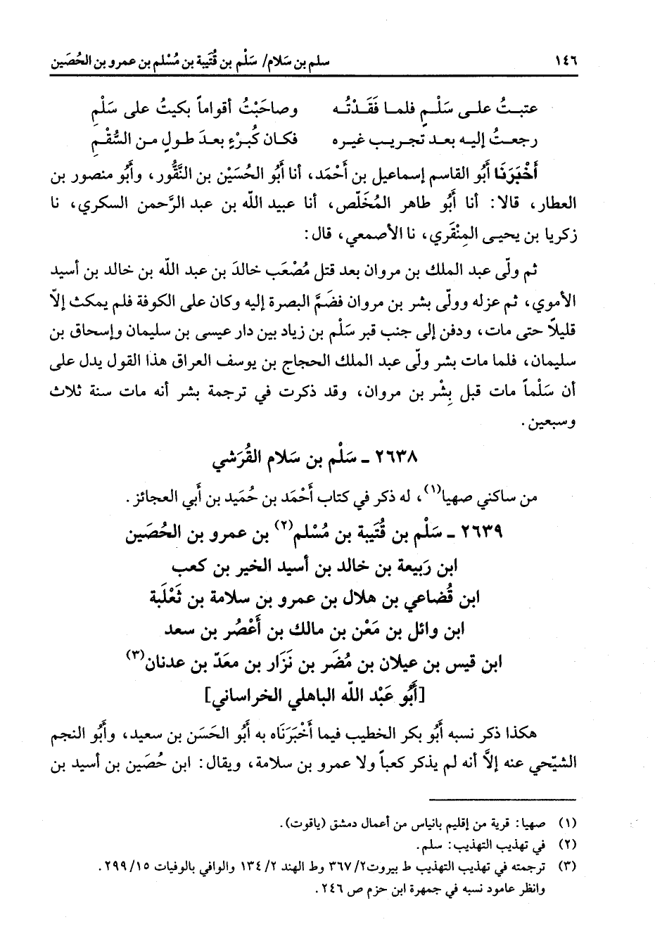 * عتبت على سلم فلما فقدته * وصاحبت أقواما بكيت على سلم رجعت إليه بعد تجريب غيره * فكان كبرء بعد طول من السقم * أخبرنا أبو القاسم إسماعيل بن أحمد أنا أبو الحسين بن النقور وأبو منصور بن العطار قالا أنا أبو طاهر المخلص أنا عبيد الله بن عبد الرحمن السكري نا زكريا بن يحيى المنقري نا الأصمعي قال ثم ولى عبد الملك بن مروان بعد قتل مصعب خالد بن عبد الله بن خالد بن أسيد الأموي ثم عزله وولى بشر بن مروان فضم البصرة إليه وكان على الكوفة فلم يمكث إلا قليلا حتى مات ودفن إلى جنب قبر سلم بن زياد بين دار عيسى بن سليمان وإسحاق بن سليمان فلما مات بشر ولى عبد الملك الحجاج بن يوسف العراق هذا القول يدل على أن سلما مات قبل بشر بن مروان وقد ذكرت في ترجمة بشر أنه مات سنة ثلاث وسبعين 2638 سلم بن سلام القرشي من ساكني صهيا (1) له ذكر في كتاب أحمد بن حميد بن أبي العجائز 2639 سلم بن قتيبة بن مسلم (2) بن عمرو بن الحصين ابن ربيعة بن خالد بن أسيد الخير بن كعب ابن قضاعي بن هلال بن عمرو بن سلامة بن ثعلبة ابن وائل بن معن بن مالك بن أعصر بن سعد ابن قيس بن عيلان بن مضر بن نزار بن معد بن عدنان (3) أبو عبد الله الباهلي الخراساني " هكذا ذكر نسبه أبو بكر الخطيب فيما أخبرناه به أبو الحسن بن سعيد وأبو النجم الشيحي عنه إلا أنه لم يذكر كعبا ولا عمرو بن سلامة ويقال ابن حصين بن أسيد بن