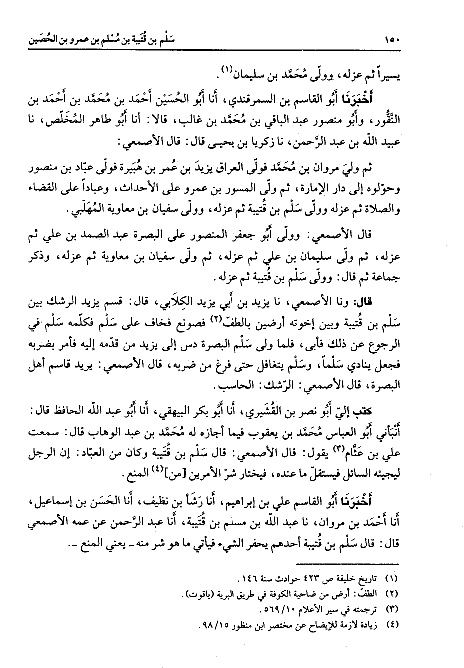 أخبرنا أبو القاسم بن السمرقندي أنا أبو الحسين أحمد بن محمد بن أحمد بن النقور وأبو منصور عبد الباقي بن محمد بن غالب قالا أنا أبو طاهر المخلص نا عبيد الله بن عبد الرحمن نا زكريا بن يحيى قال قال الأصمعي ثم ولي مروان بن محمد فولى العراق يزيد بن عمر بن هبيرة فولى عباد بن منصور وحولوه إلى دار الإمارة ثم ولى المسور بن عمرو على الأحداث وعبادا على القضاء والصلاة ثم عزله وولى سلم بن قتيبة ثم عزله وولى سفيان بن معاوية المهلبي قال الأصمعي وولى أبو جعفر المنصور على البصرة عبد الصمد بن علي ثم عزله ثم ولى سليمان بن علي ثم عزله ثم ولى سفيان بن معاوية ثم عزله وذكر جماعة ثم قال وولى سلم بن قتيبة ثم عزله قال ونا الأصمعي نا يزيد بن أبي يزيد الكلابي قال قسم يزيد الرشك بين سلم بن قتيبة وبين إخوته أرضين بالطف (2) فصونع فخاف على سلم فكلمه سلم في الرجوع عن ذلك فأبى فلما ولى سلم البصرة دس إلى يزيد من قدمه إليه فأمر بضربه فجعل ينادي سلما وسلم يتغافل حتى فرغ من ضربه قال الأصمعي يريد قاسم أهل البصرة قال الأصمعي الرشك الحاسب كتب إلي أبو نصر بن القشيري أنا أبو بكر البيهقي أنا أبو عبد الله الحافظ قال أنبأني أبو العباس محمد بن يعقوب فيما أجازه له محمد بن عبد الوهاب قال سمعت علي بن عثام (3) يقول قال الأصمعي قال سلم بن قتيبة وكان من العباد إن الرجل ليجيئه السائل فيستقل ما عنده فيختار شر الأمرين من (4) المنع أخبرنا أبو القاسم علي بن إبراهيم أنا رشأ بن نظيف أنا الحسن بن إسماعيل أنا أحمد بن مروان نا عبد الله بن مسلم بن قتيبة أنا عبد الرحمن عن عمه الأصمعي قال قال سلم بن قتيبة أحدهم يحفر الشئ فيأتي ما هو شر منه يعني المنع